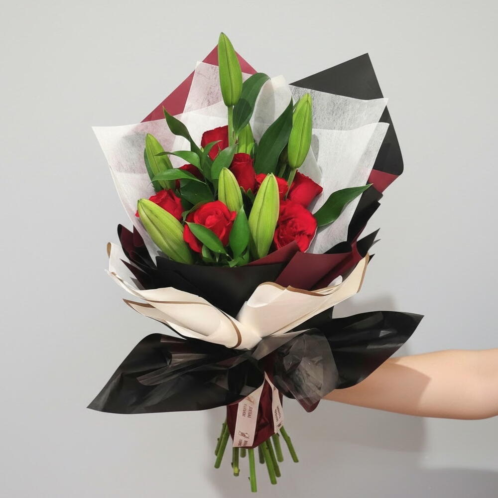 Этот потрясающий букет представляет собой яркое сочетание красных роз и свежих зелёных лилий, создавая идеальную гармонию цвета и аромата. Яркие красные розы символизируют любовь и страсть, а лилии с их элегантными бутонами добавляют нотку изысканности и свежести. Букет упакован в тёмно-красную, чёрную и белую папиросную бумагу, что создаёт современный и шикарный образ, одновременно роскошный и привлекающий внимание. Эта прекрасная композиция идеально подходит для выражения самых глубоких чувств по особым случаям, таким как годовщины, романтические торжества, или просто для того, чтобы кто-то почувствовал себя дорогим. Для ухода регулярно меняйте воду и подрезайте стебли примерно на 1 см каждые несколько дней, чтобы они дольше оставались свежими. Храните букет в прохладном месте, вдали от прямых солнечных лучей, чтобы он оставался ярким.