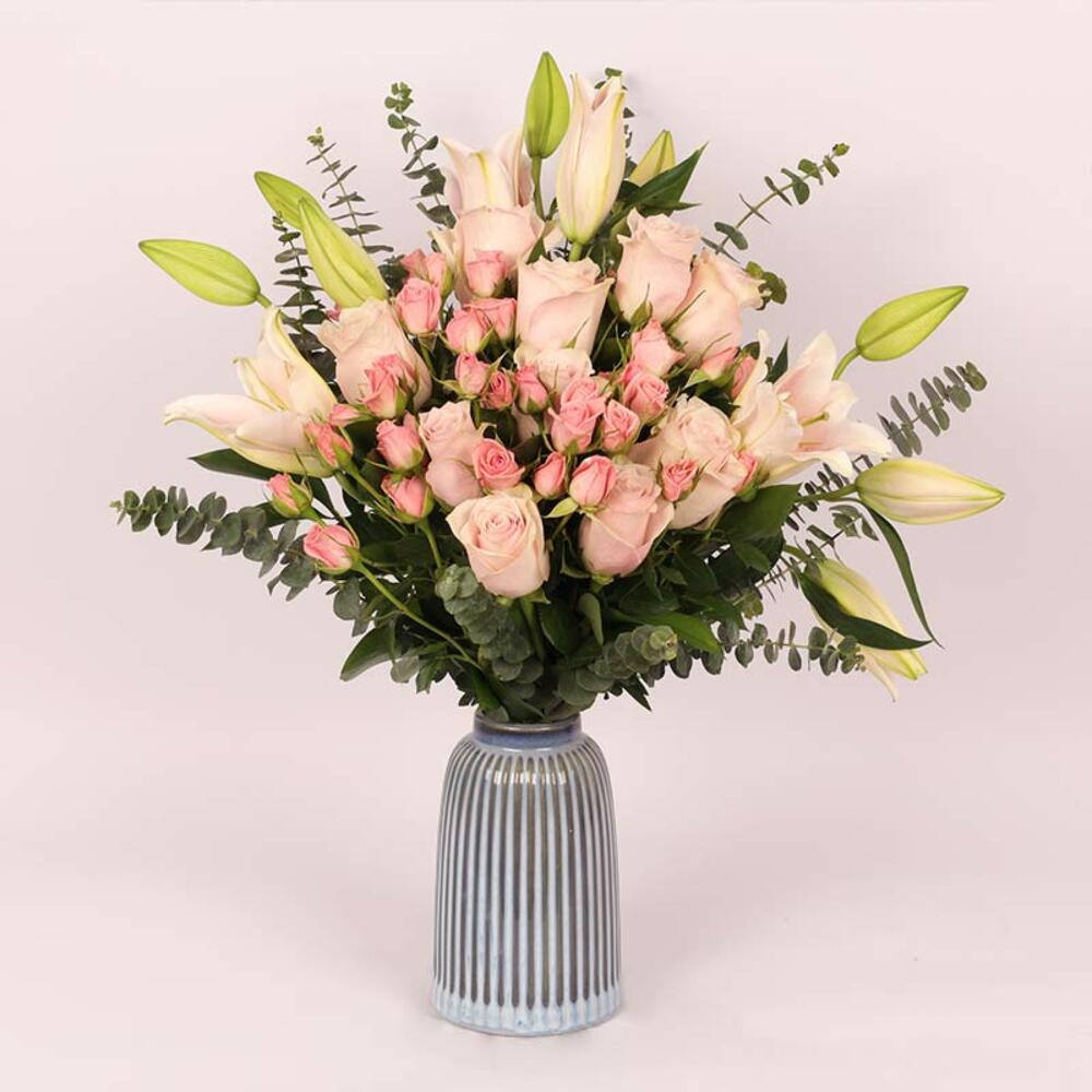 3 ветки розовых восточных лилий, 10 розовых роз, 6 веток розовых маленьких роз, 5 веток нежно-голубого эвкалипта, подготовленные в высококачественной синей керамической стеклянной вазе размером 11,5x20 см.