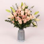 Pink rose - 10 шт. розовая мини-роза - 6 шт. эвкалипт бэби блю - 5 шт. розовые восточные лилии - 3 шт. ceramic glass vase - 1 шт.