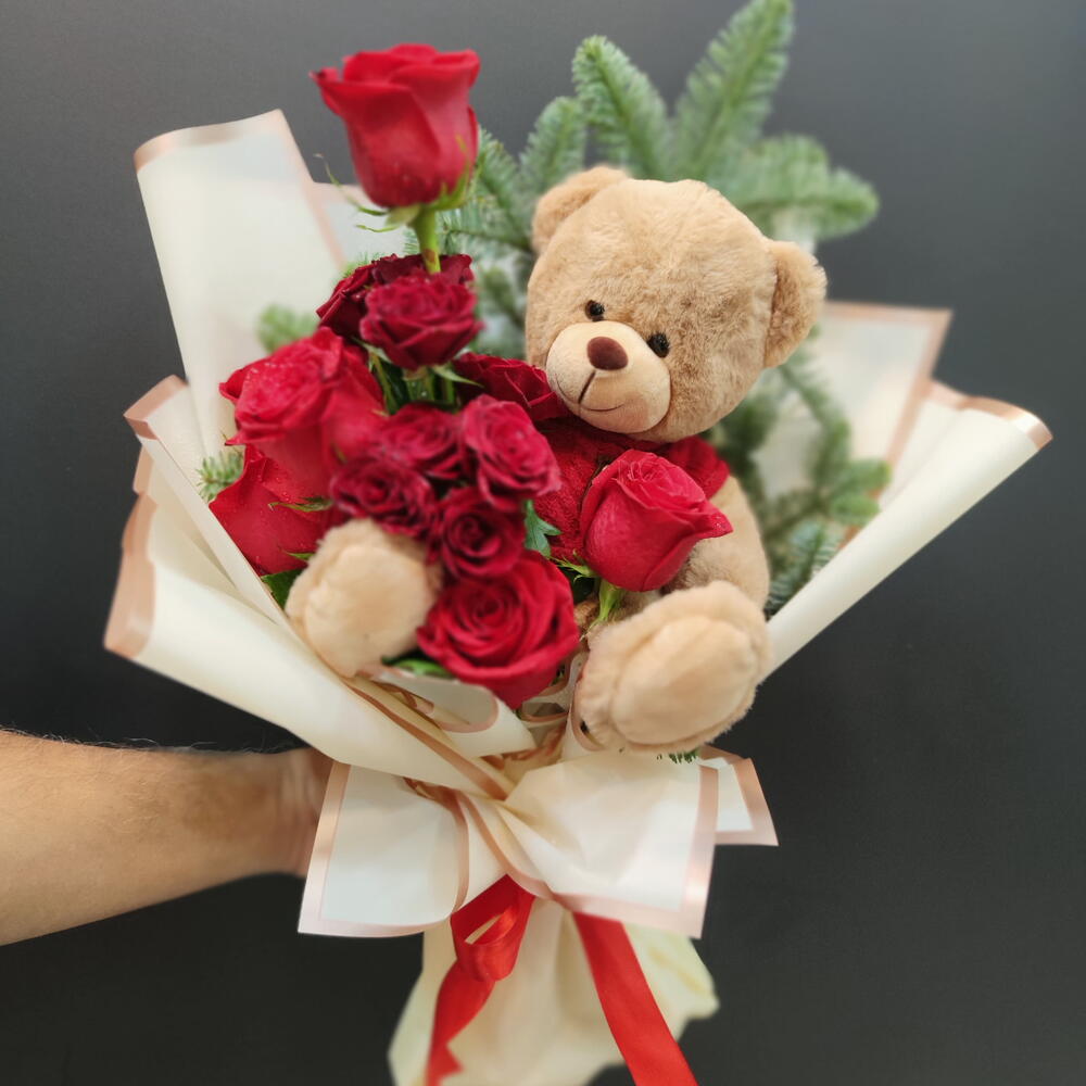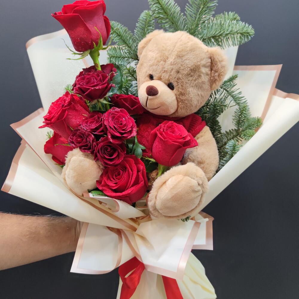 rose - 25 шт. caspia - 5 шт. эукалей - 5 шт. тэдди - 1 шт. красивая красная упаковочная бумага - 25 шт.