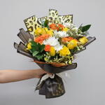 Этот яркий букет наполнен солнечными тонами, сочетая радостные жёлтые, тёплые оранжевые и свежие белые оттенки в живой, вдохновляющей композиции. Идеален для дней рождения, годовщин, праздников, подарков в знак благодарности или просто чтобы скрасить чей‑то день — он приносит тепло и радость в любой случай. Розы создают богатое, элегантное ядро, а нежные белые цветки добавляют мягкость и баланс. Свежая зелень придаёт аранжировке натуральность и лёгкость, делая её подходящей как для праздничных моментов, так и для трогательных жестов. Стильная упаковка с выразительным рисунком подчёркивает современный, привлекающий внимание вид. Поместите букет в чистую воду как можно скорее, чтобы сохранить его свежим и сияющим. Обрезайте стебли ежедневно на 1–2 см и держите цветы вдали от прямых солнечных лучей и сквозняков, чтобы обеспечить длительную красоту.