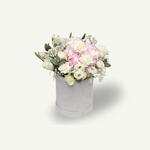 Микс из 15 белых роз, 1 розовой гортензии, 10 белых гвоздик, 5 белых стеблей лизиантуса и белой гипсофилы, аккуратно оформленный в белой бархатной коробке для элегантной и вневременной презентации.