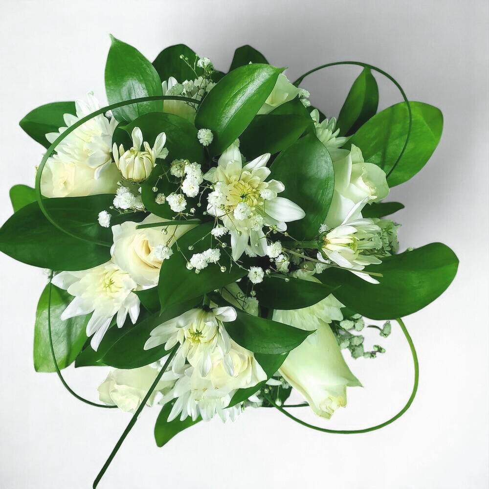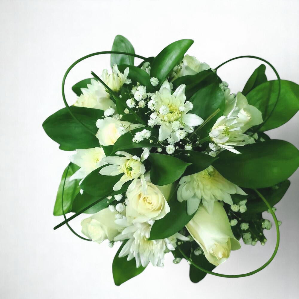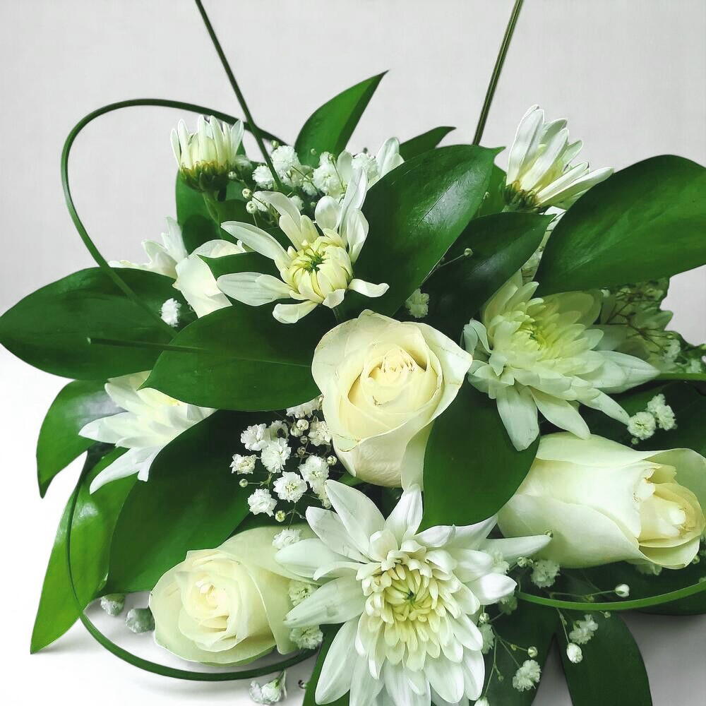 Изысканный букет в мягкой палитре слоновой кости; эта композиция сочетает в себе вечную элегантность белых роз с нежными хризантемами и воздушной гипсофилой. Акцентированный пышной зеленью и декоративными петлями, он идеален для свадеб, соболезнований или чтобы передать чистые, искренние чувства. Его гармоничная цветовая гамма и утончённая композиция создают успокаивающую и роскошную эстетичность. Чтобы букет дольше оставался свежим, поставьте его в чистую воду, меняйте воду каждые два дня и подрезайте стебли под углом. Избегайте прямых солнечных лучей, источников тепла и холодных сквозняков.
