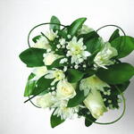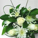 White rose - 7 шт. Gypsophila - 3 шт. chrysanthemum single - 9 шт. ruscus israel - 4 шт.