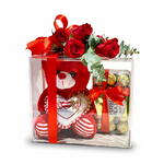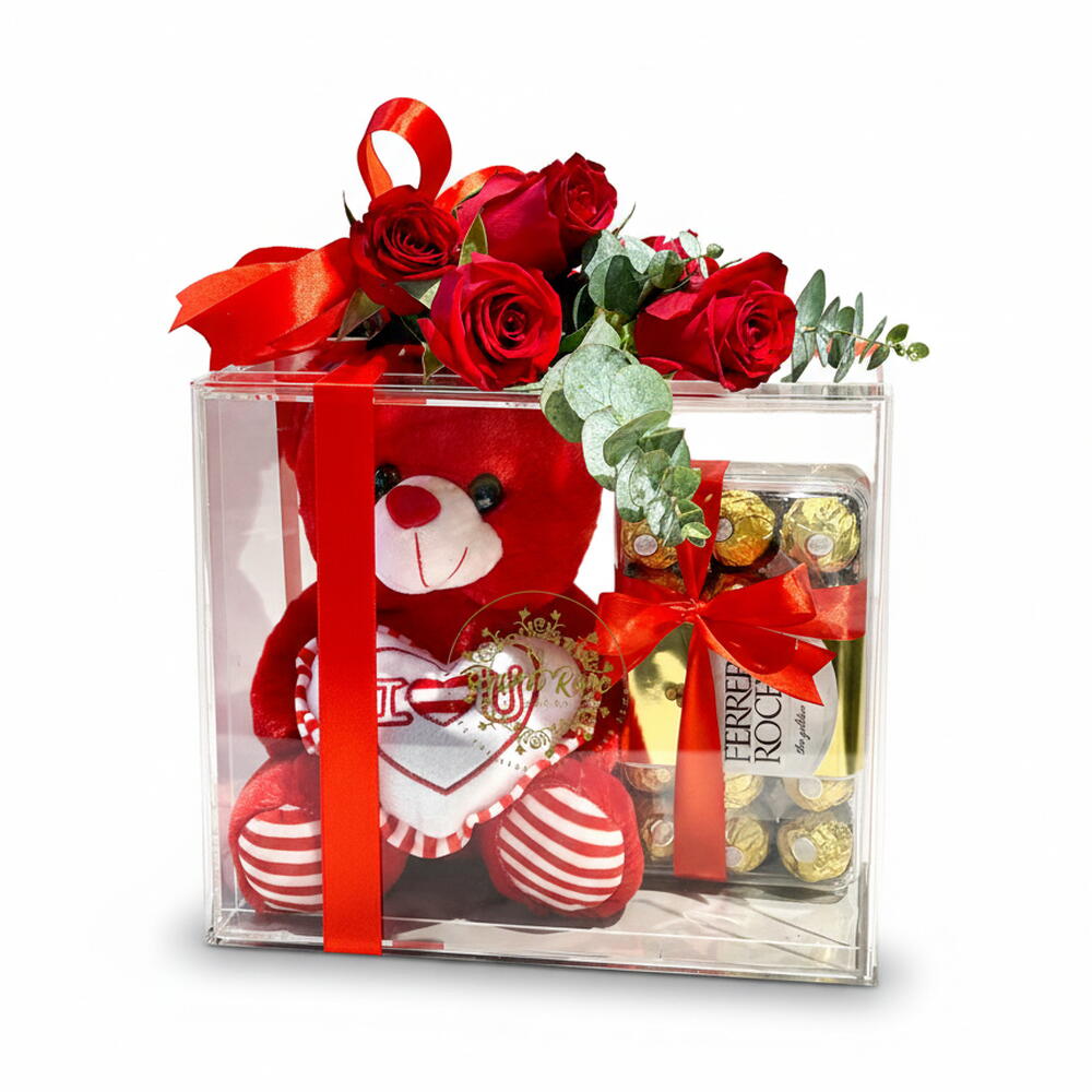 Eucalyptus - 1 шт. Ferrero rocher - 375 гр. Teddy bear - 25 см акриловая коробка - 1 шт. red roses - 5 шт.