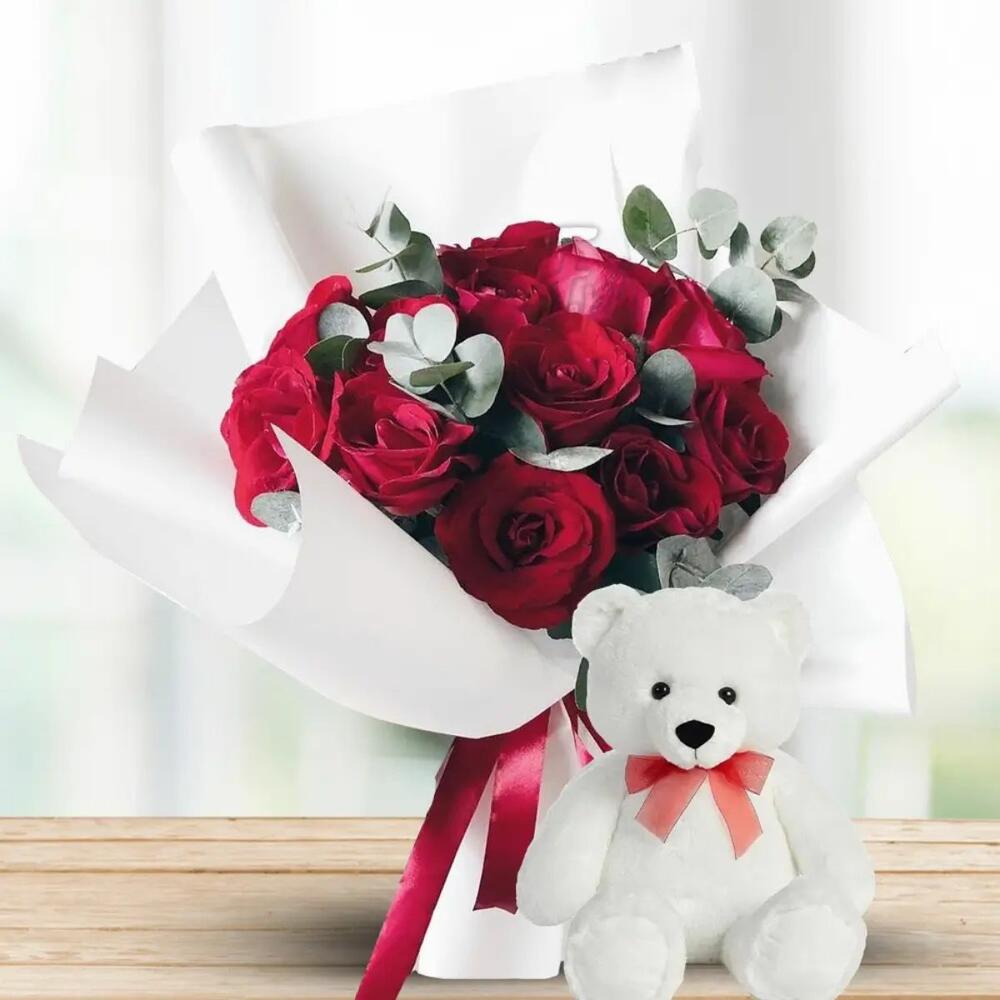 Романтический жест, говорящий от сердца — этот букет включает 15 потрясающих красных роз в сочетании со свежими листьями эвкалипта и пышной зеленью. В комплекте 12-дюймовый медвежонок — это идеальный подарок, чтобы выразить любовь и тепло в День святого Валентина, на годовщины или для особых случаев.