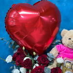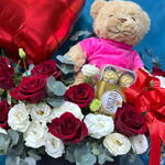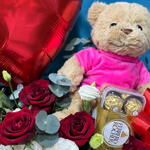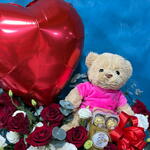 Red rose - 11 шт. Black round box - 1 шт. ribbon satin - 1 шт. white lisianthus - 5 шт. eucalyptus leaves - 4 шт. плюшевый мишка (24 см) - 1 шт. шоколадные конфеты ferrero rocher 16 шт - 1 шт. фольгированный шар в форме сердца - 1 шт.