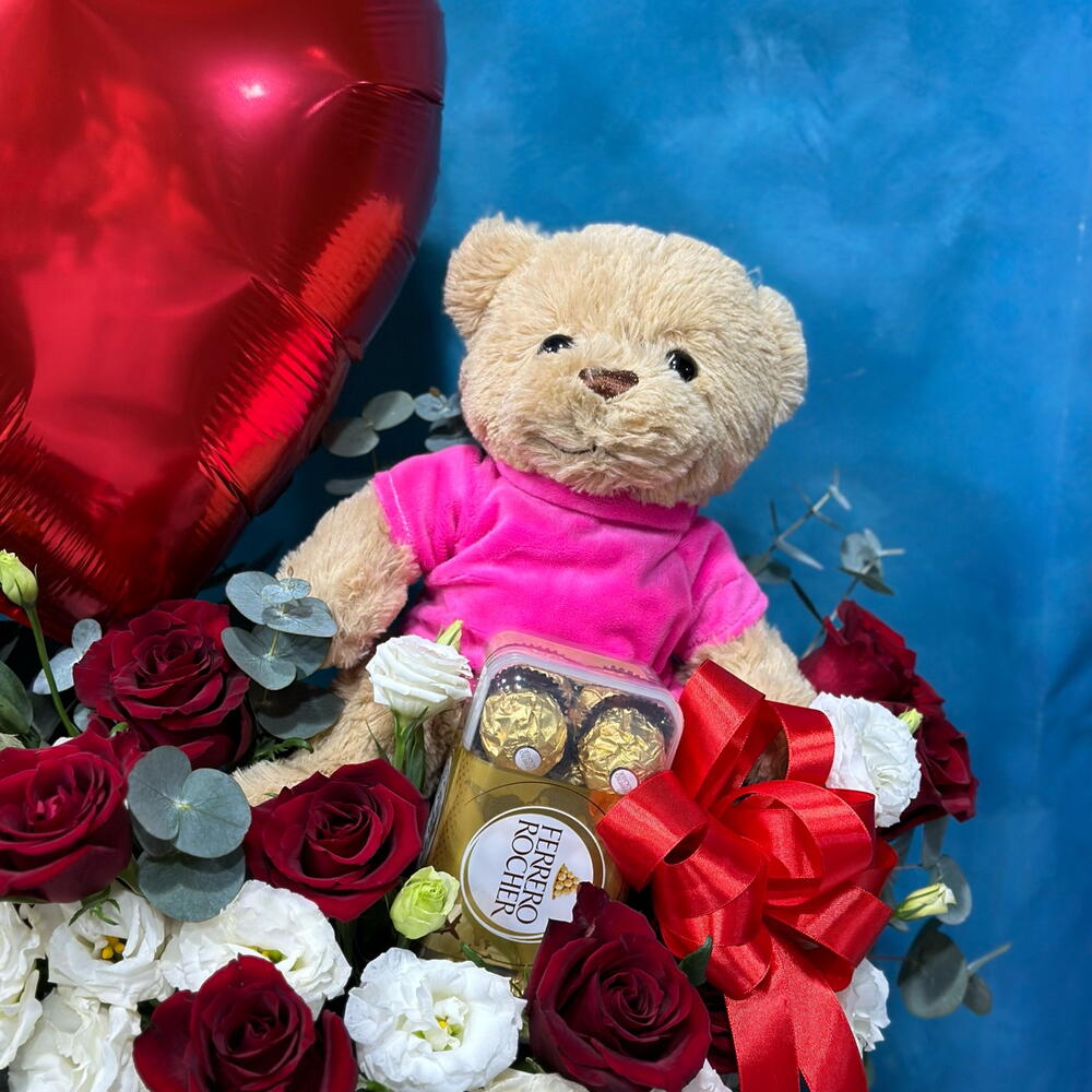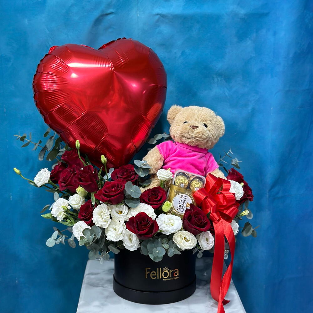 Red rose - 11 шт. Black round box - 1 шт. ribbon satin - 1 шт. white lisianthus - 5 шт. eucalyptus leaves - 4 шт. плюшевый мишка (24 см) - 1 шт. шоколадные конфеты ferrero rocher 16 шт - 1 шт. фольгированный шар в форме сердца - 1 шт.