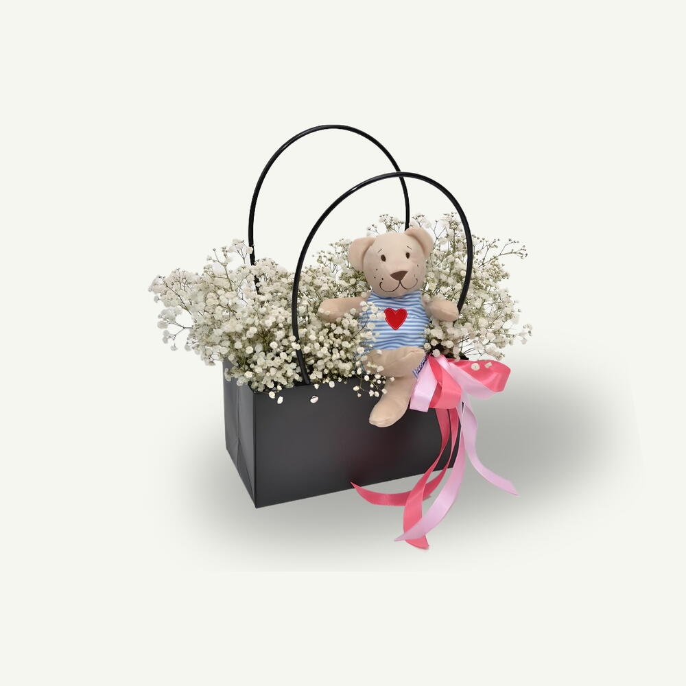 Композиция с милым плюшевым медвежонком и нежной белой гипсофилой, продуманно оформленная в очаровательной сумочке — трогательный и запоминающийся подарок.