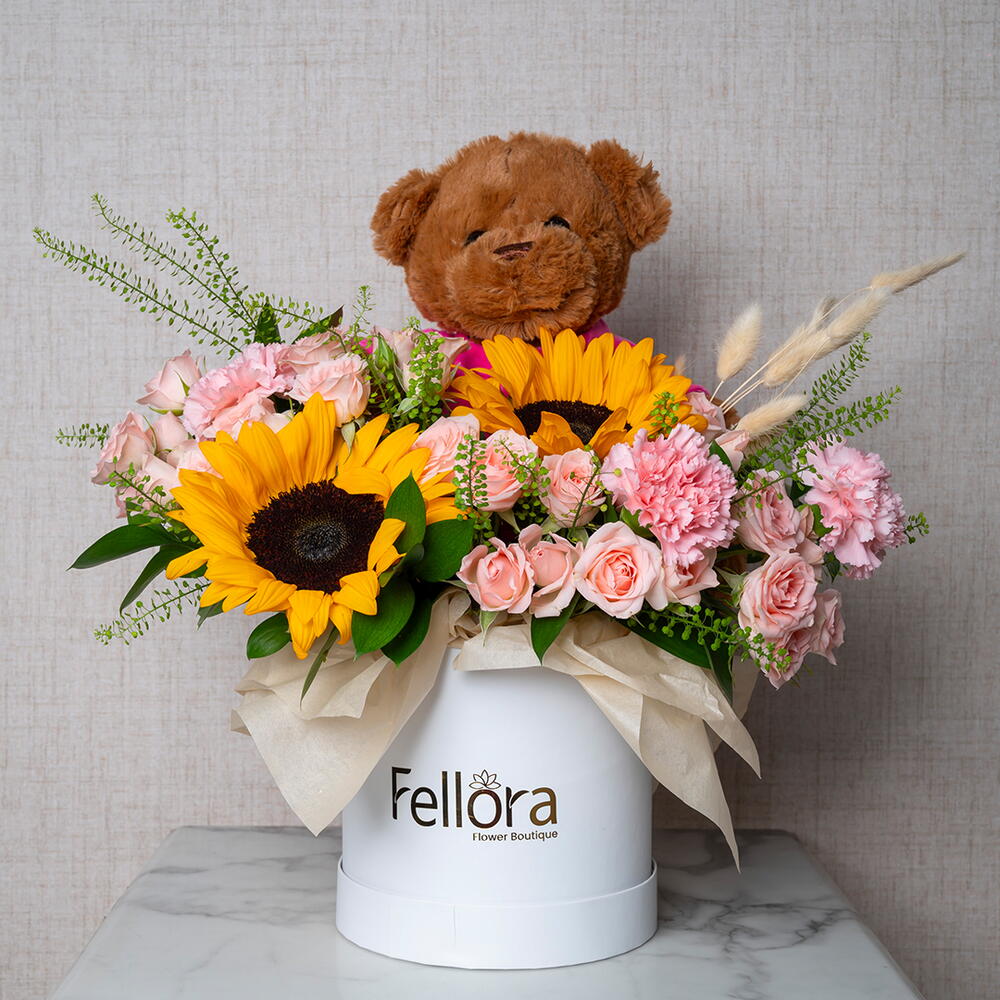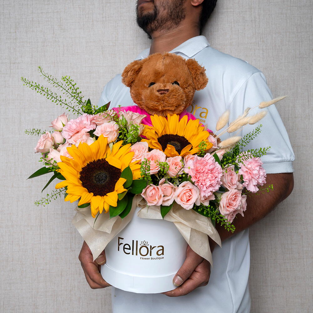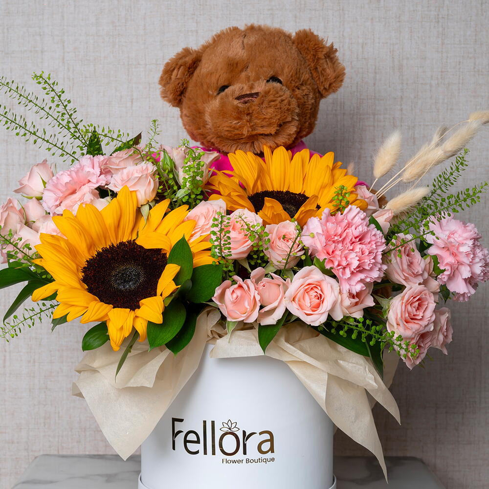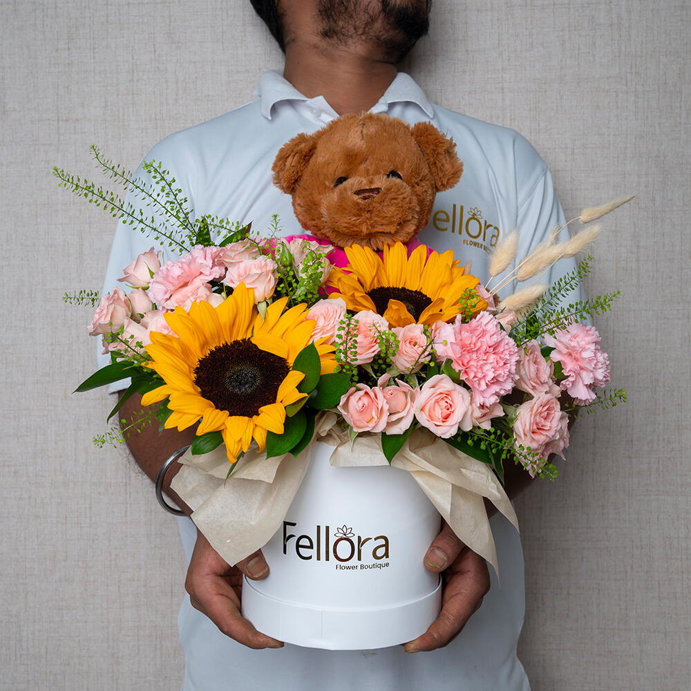 Представляем «Солнечный сад Тедди» – восхитительную и трогательную композицию, доступную эксклюзивно в цветочном бутике Fellora Flower Boutique Dubai. Этот уникальный букет состоит из 2 сияющих подсолнухов, 3 нежных розовых гвоздик, 6 очаровательных кустовых роз сорта «Свит Сара», 3 веточек свежего липидиума Green Lipidium, 7 причудливых кроличьих хвостиков и 5 элегантных листьев рускуса. В сочетании с плюшевым коричневым плюшевым мишкой этот букет – идеальное сочетание тепла, радости и нежности. «Солнечный сад Тедди» идеально подходит для любого случая: празднуете ли вы особый момент, посылаете любовное послание или просто хотите поднять кому-то настроение. Яркие подсолнухи символизируют радость и позитив, а нежно-розовые гвоздики и сладкие кустовые розы добавляют нотку утонченной красоты. Зеленые листья липидиума и рускуса создают пышный фон, а кроличьи хвостики придают композиции игривую, неповторимую текстуру. Каждый букет Teddy's Sunshine Garden тщательно собран вручную нашими опытными флористами, которые гарантировали идеальное расположение каждого элемента, подчёркивая его природную красоту. Этот букет, представленный в элегантной упаковке и дополненный очаровательным коричневым плюшевым мишкой, создан, чтобы очаровать и вызвать улыбку на лице любого. Почувствуйте тепло и радость с букетом Teddy's Sunshine Bouquet от цветочного бутика Fellora Flower Boutique Dubai, где каждый цветок и подарок – это история любви и счастья.