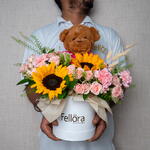 Ruscus - 5 шт. Sunflower - 2 шт. carnation pink - 3 шт. Свит Сара кустовая роза - 6 шт. bunny tails - 7 шт. белая бумажная коробка - 1 шт. зелёный липудиум - 3 шт. коричневый плюшевый мишка - высота 30 ширина 25 - 1 шт.