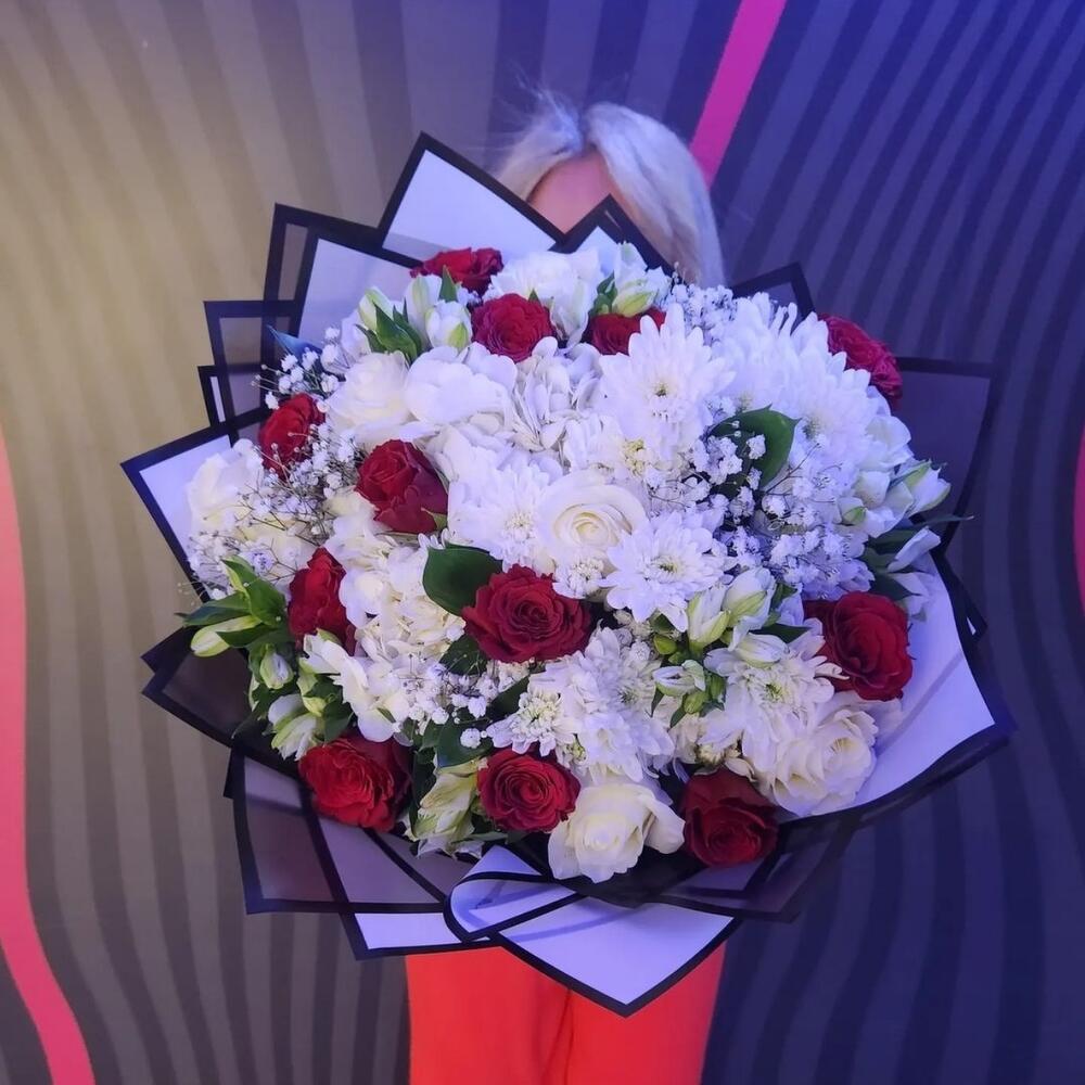 Смесь потрясающих свежих цветов красного и белого цвета. Смесь красных роз с белой гортензией, белой розой, альстромерией и спрей-хризантемой, смешанной с декоративной зеленью. Включая декоративную упаковочную бумагу.