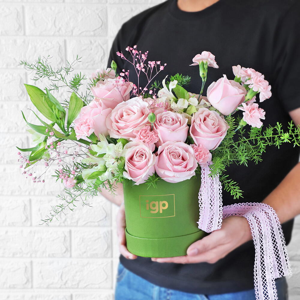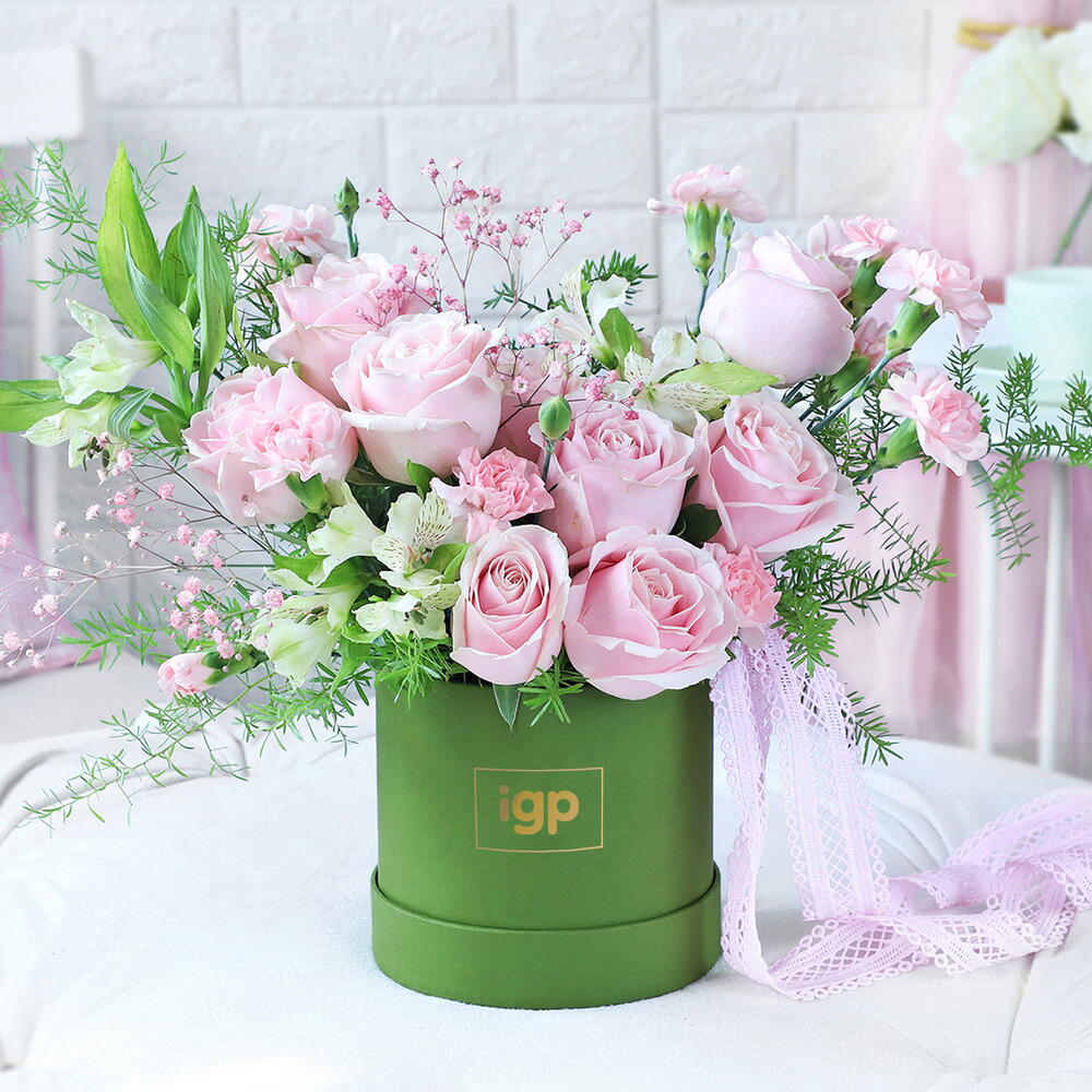 Цветущая история из роз Свит Аваланш, зелёной альстромерии, розовых гвоздик, гипсофилы и аспарагуса спренгери, собранная в маленькую шалфейно-зелёную коробочку.