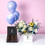 Очаровательная композиция из белых и жёлтых цветов — роз, гортензий, гербер и краспедий — со свежим эвкалиптом и плюшевым медвежонком, красиво оформленная в небольшой круглой белой коробке. В паре с премиальной коробкой шоколадных конфет (25 шт.) и радостными воздушными шарами это идеальный подарок, чтобы приветствовать новорождённого мальчика с теплом, сладостью и радостью.