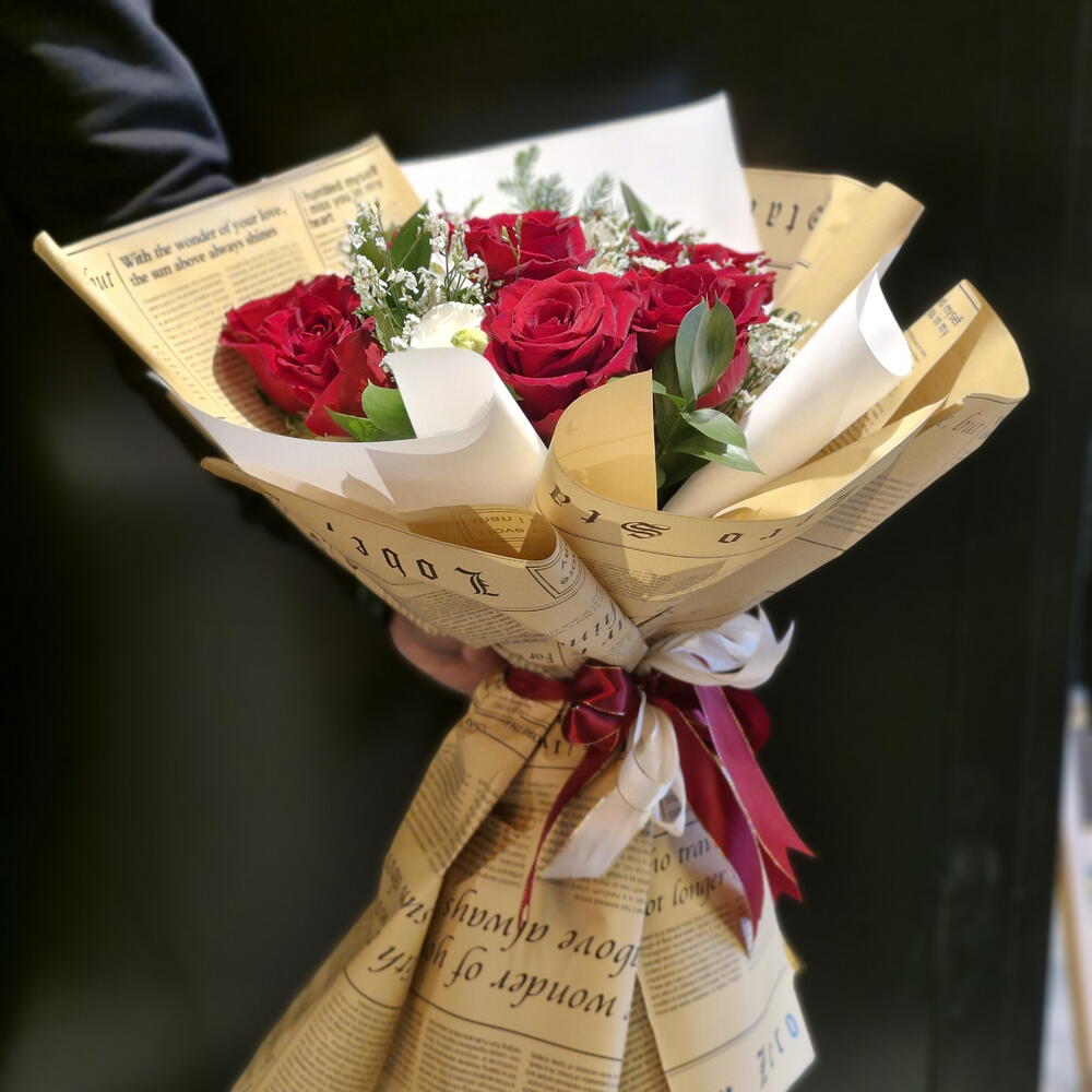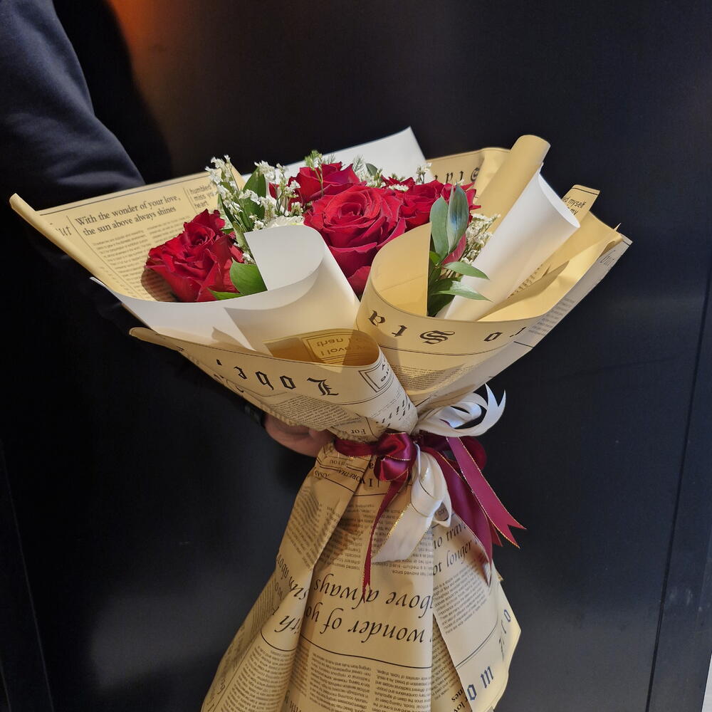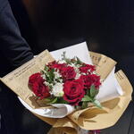 Red rose - 10 шт. Lisianthus - 2 шт. листья рускуса - 10 шт. астремелия - 1 шт. лимониум белый - 10 шт.