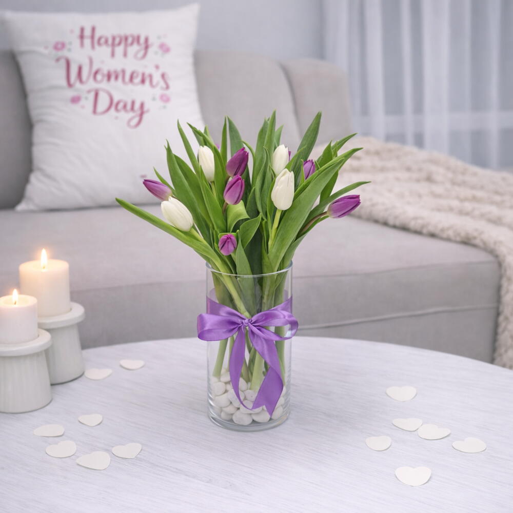 glass vase - 1 шт. white tulip - 5 шт. purple tulip - 6 шт. фиолетовая лента - 1 шт.