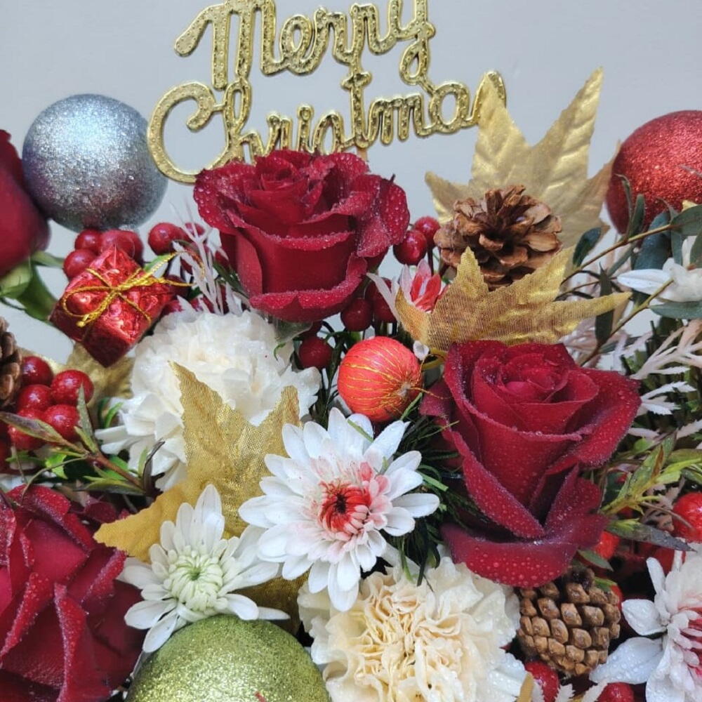 Великолепная и праздничная композиция, представленная в отражающей золотой цилиндрической вазе. В ней сочетаются насыщенные тёмно-красные розы, белые гвоздики и хризантемы в форме звезды, дополненные блестящей золотой листвой, шишками и ярко-красными ягодами. Сверху — надпись «Merry Christmas» и разнообразные цветные украшения; это роскошный акцент для любого праздничного стола.