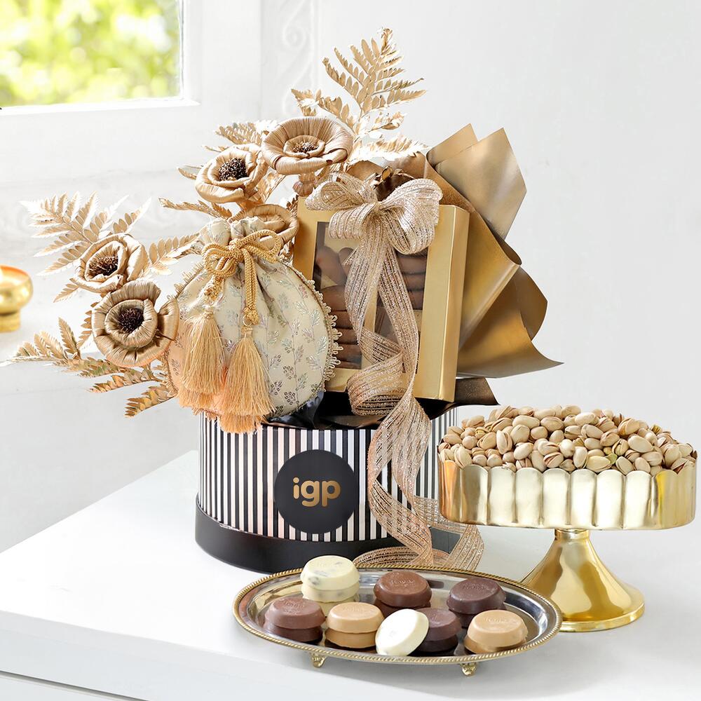 Минималистичный, но при этом эффектный, этот набор, оформленный в черно-белой полосатой коробке, включает золотые сухоцветы из пробкового дерева, фисташки в золотом мешочке-потли и подарочную коробку с ассорти фисташкового шоколада. Отправьте этот набор с вкусными угощениями вашему особенному человеку и сделайте его день незабываемым.