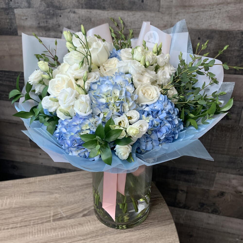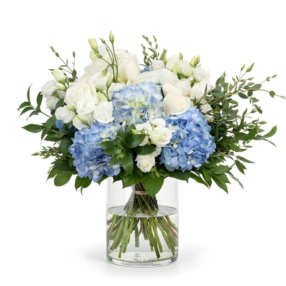4 голубые гортензии, 10 белых кустовых роз, 10 белых лизиантусов, 4 стебля парвифолии, 5 веточек рускуса в стеклянной вазе.