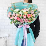 Подобно древней сказке, полной драматизма и яркости, розы Sweet Avalanche, розы Джумилла, персиковые розы, белые дисбуды, розовые гвоздики, эвкалипт и камини в величественной бирюзово-зелёной упаковке с розовой кружевной лентой передают сильную ноту нежности и заботы.