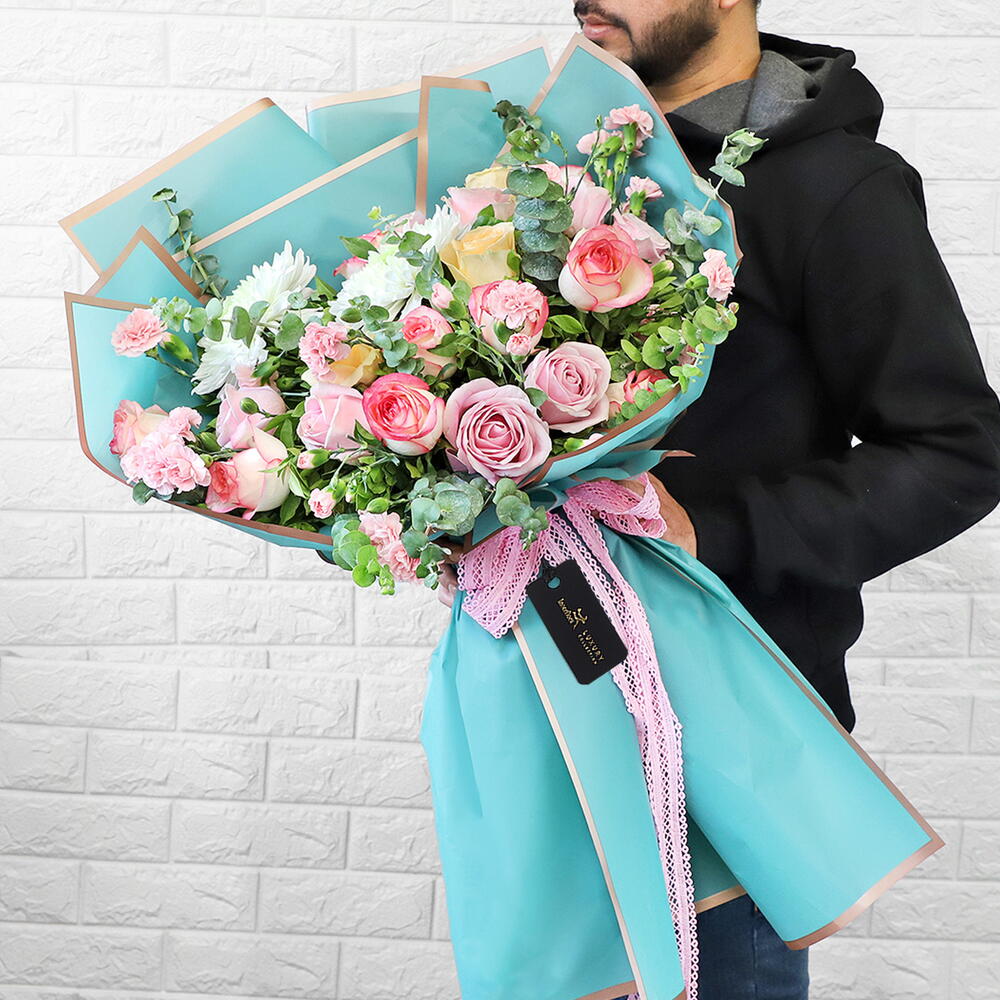 Подобно древней сказке, полной драматизма и яркости, розы Sweet Avalanche, розы Джумилла, персиковые розы, белые дисбуды, розовые гвоздики, эвкалипт и камини в величественной бирюзово-зелёной упаковке с розовой кружевной лентой передают сильную ноту нежности и заботы.