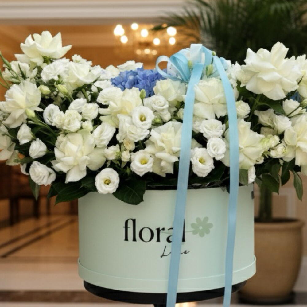 hydrangeas - 2 шт. white lisianthus - 35 шт. белые альстромерии - 9 шт. white roses - 21 шт. белые спрей-розы - 13 шт. фирменная коробка - 1 шт.