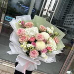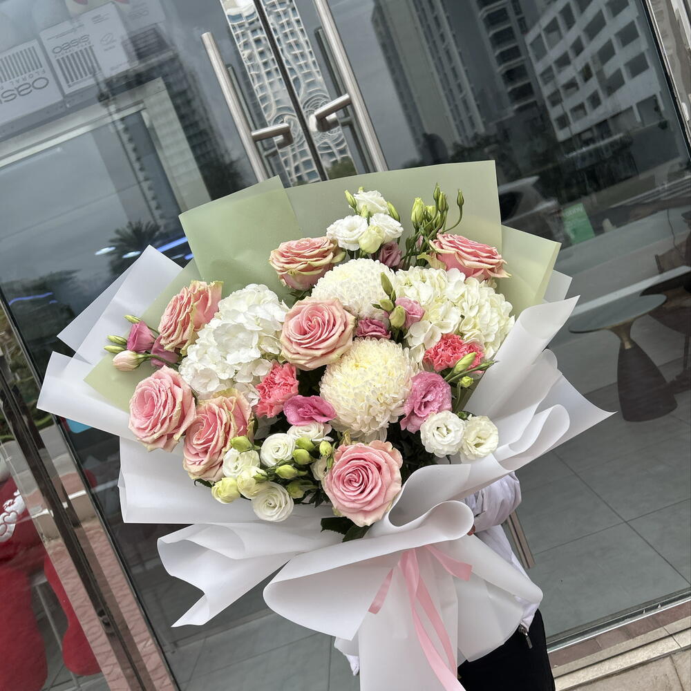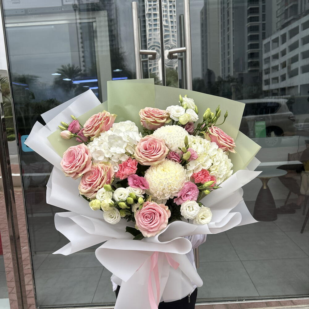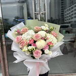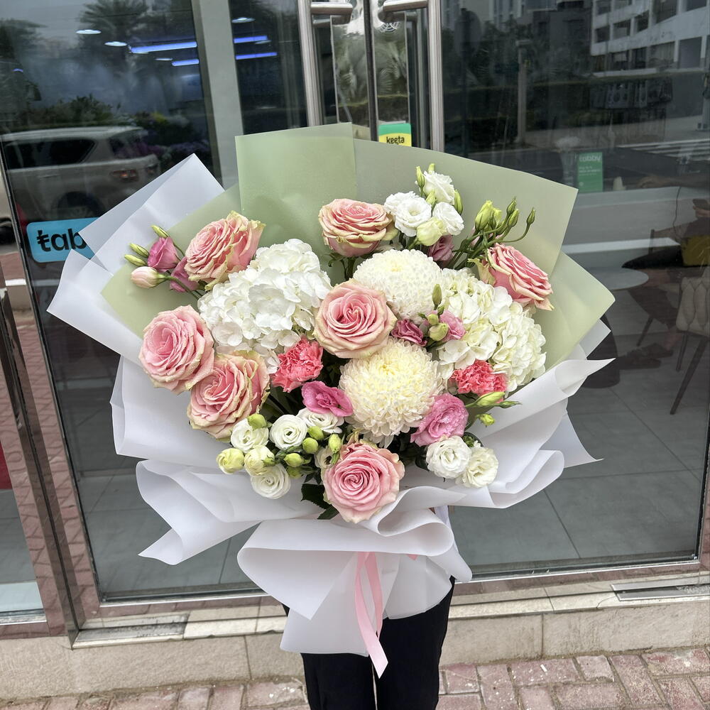 white lisianthus - 3 шт. pink lisianthus - 3 шт. белые гортензии - 2 шт. белый декор - 2 шт. премиум розовые розы - 7 шт.