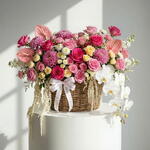 A multi-dimensional architectural masterpiece featuring cascading white Phalaenopsis orchids and exotic pink Anthuriums. Exquisitely layered with premium magenta roses and dramatic trailing amaranthus in a luxury hand-woven basket. The ultimate grand-scale statement of modern floral luxury, designed for the most distinguished celebrations. • Please Note: As flowers are natural products, actual colors may vary slightly from digital images due to seasonal growth and lighting conditions. We guarantee that the overall style and premium quality as well as freshness of your arrangement will always be maintained.