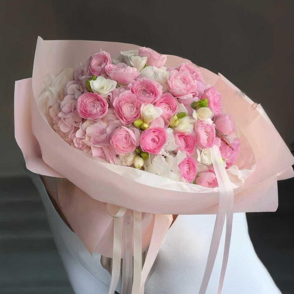 White freesia - 6 шт. ranunculus pink - 20 шт. hydrangea white - 6 шт. нежно-розовая гортензия - 5 шт.