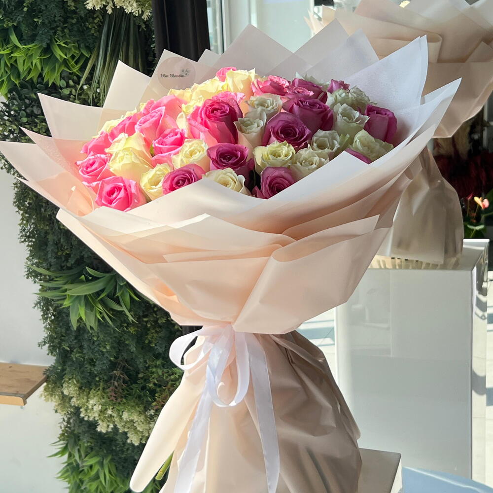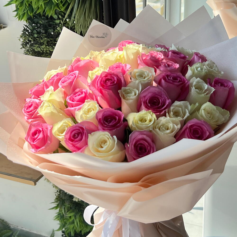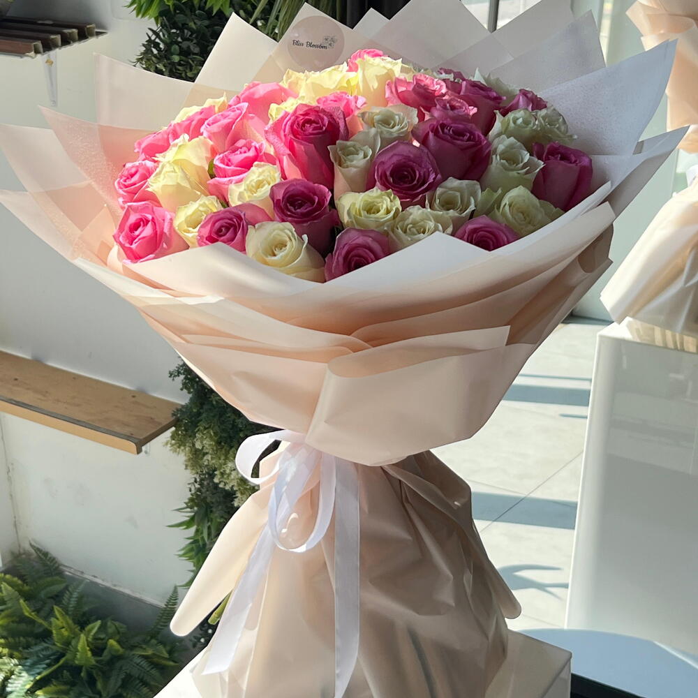 Ощутите расцвет любви, благодати и чистоты с этим потрясающим моно-букетом. Мастерски составленный, он представляет собой гармоничное сочетание 25 нежных розовых роз, символизирующих восхищение, радость и благодарность, эффектно контрастирующее с 26 безупречно белыми розами, символизирующими чистоту, невинность и очарование. Этот букет — вечное свидетельство красоты и искреннее послание глубоких чувств. Идеален для любого случая: каждый цветок был тщательно отобран, чтобы обеспечить долговечность и максимальную свежесть.