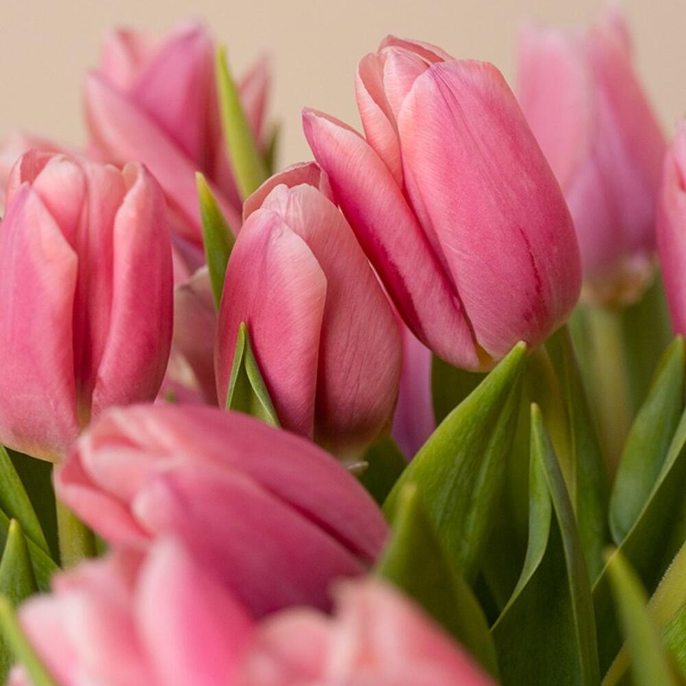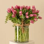 Eucalyptus - 10 шт. pink tulips - 40 шт. raffia ribbon - 1 шт. прозрачная стеклянная ваза - 1 шт.