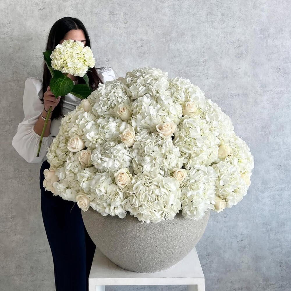 White rose - 30 шт. Vase - 1 шт. white hydrangea - 30 шт.