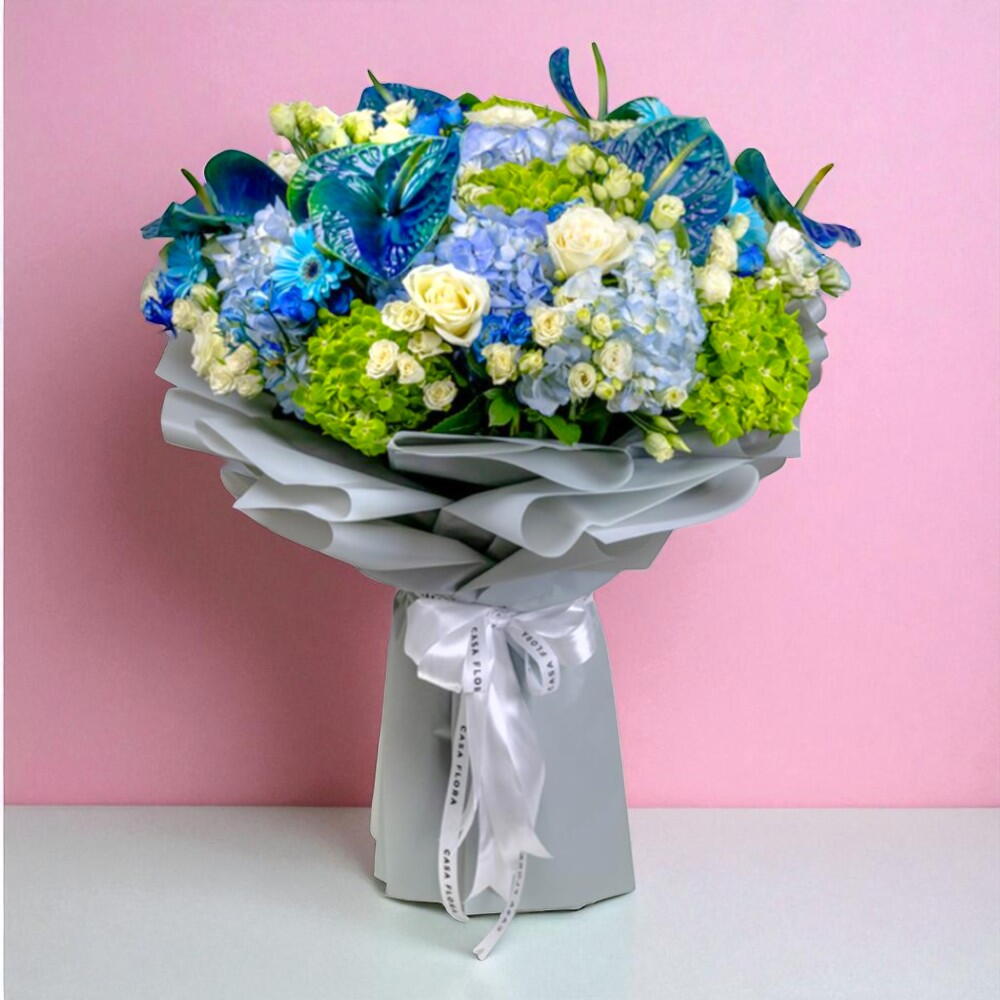 Наш букет Mix Fresh Flower — яркое сочетание цветов и бутонов, тщательно отобранных вручную, чтобы создать уникальную и потрясающую композицию. Благодаря смеси свежих цветов этот букет содержит голубую гортензию, зелёную гортензию, антуриум, белую герберу, белую розу, белый лизиантус и аромат, делая его идеальным для того, чтобы скрасить чей-то день!