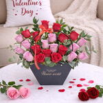 Описание - Прекрасная трогательная композиция из 11 красных роз и 11 светло-фиолетовых роз, украшенная зелёным рускусом и эвкалиптом, в дизайнерской шестигранной чёрной сумке для переноски, перевязанной красным бантом.