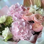 White rose - 10 шт. white carnations - 2 шт. green carnations - 4 шт. pink hydrangea - 2 шт. розовый антуриум - 2 шт. розовый ранункулюс - 7 шт.