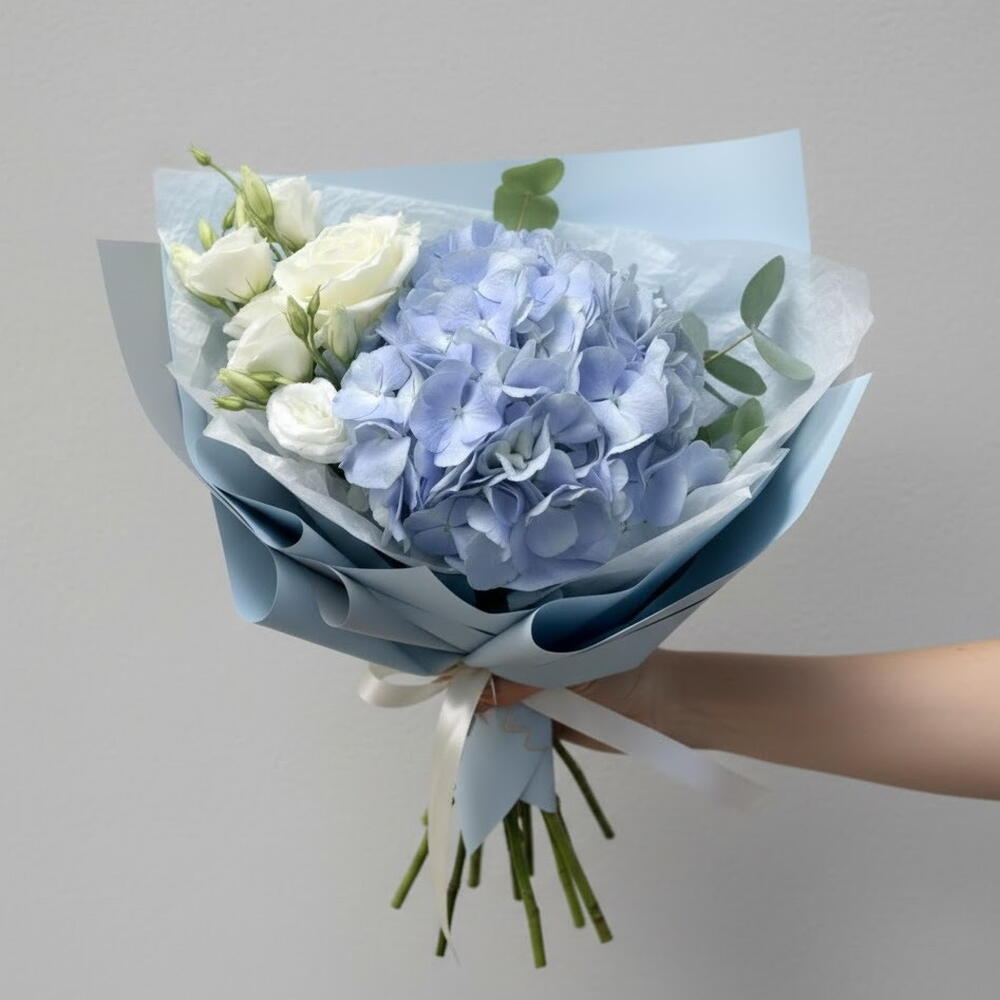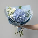 Eucalyptus - 2 шт. Wrapping - 2 шт. white carnations - 3 шт. blue hydrangea - 1 шт.