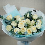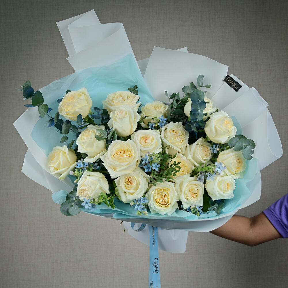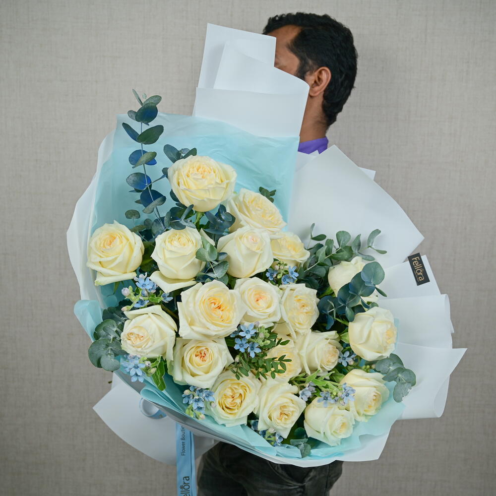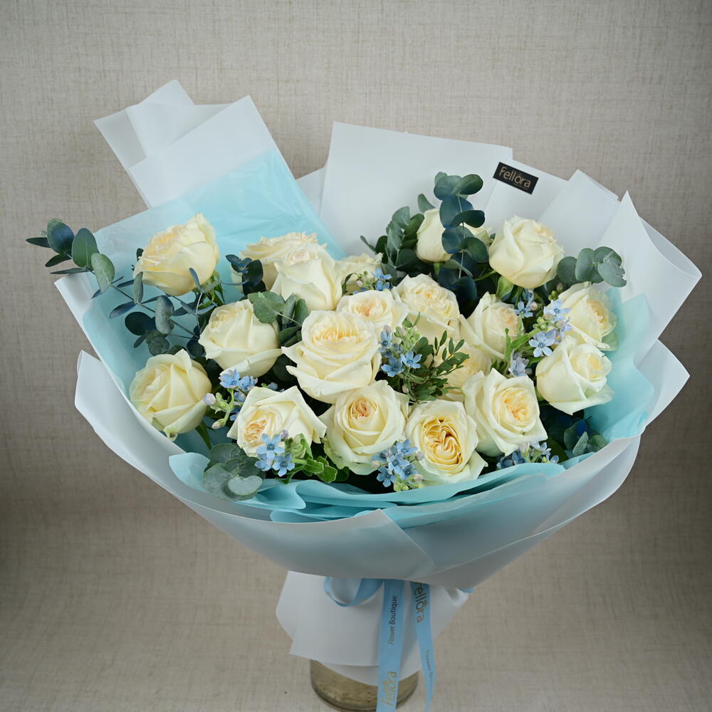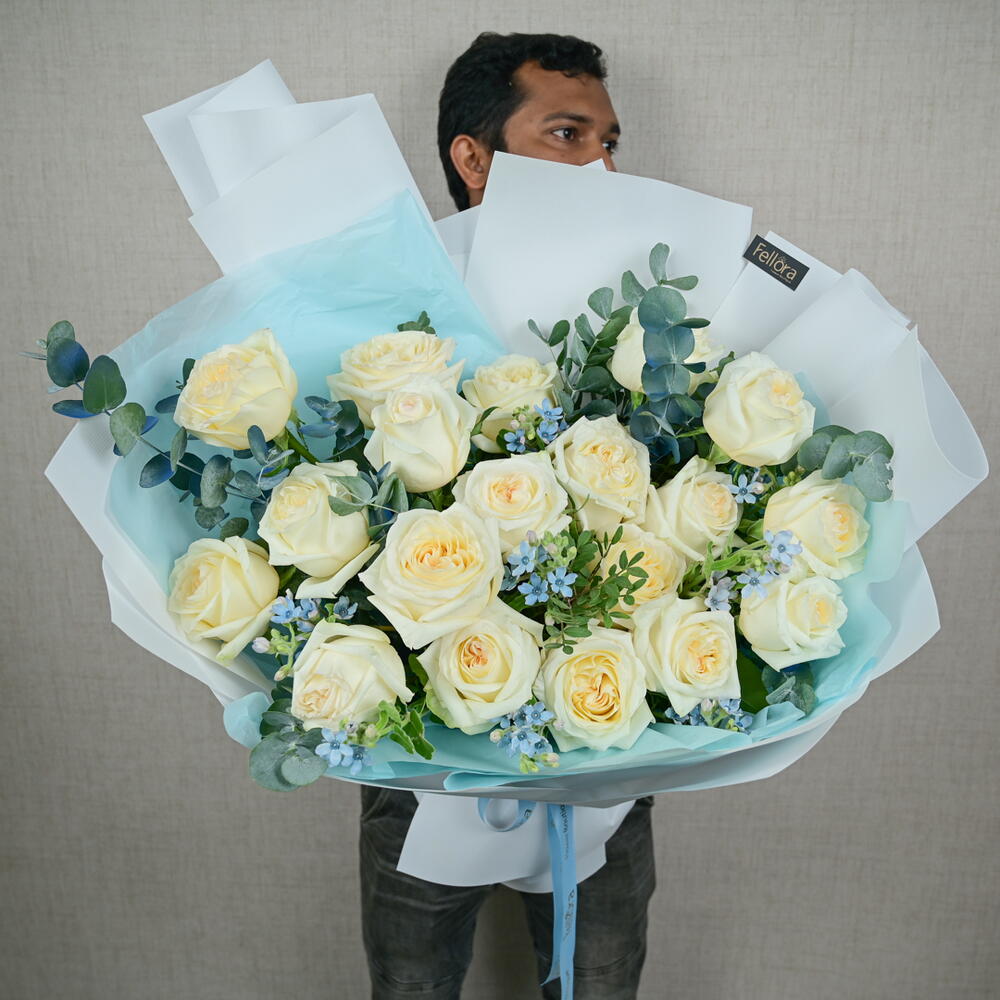 Насладитесь безмятежной красотой нашего букета «Спокойная элегантность», тщательно составленного цветочным бутиком Fellora Flower Boutique Dubai. Эта изысканная композиция представляет собой гармоничное сочетание цветов премиум-класса: 19 веток белых роз премиум-класса: каждая роза излучает чистоту и элегантность своими нежными лепестками. 7 веток синего оксипетала: добавляют нежный оттенок синего, подчеркивая безмятежную красоту букета. 5 веток эвкалипта: придают свежую, ароматную зелень, дополняющую цветочную композицию. Размеры: Высота: 50 см Ширина: 50 см Букет «Спокойная элегантность» идеально подходит для особых случаев, в качестве трогательного подарка или в качестве элегантного центрального элемента интерьера. Он привнесет нотку спокойствия и утонченности в любую обстановку. Позвольте цветочному бутику Fellora Flower Boutique Dubai доставить этот изысканный цветочный шедевр прямо к вашему порогу, преобразив ваше пространство своей непреходящей красотой. Почему стоит выбрать букет «Спокойная элегантность»? Тщательно подобранная композиция из отборных цветов для создания роскошной и умиротворяющей композиции. Идеально подходит для создания изысканного акцента на любом мероприятии или в качестве изысканного подарка. Наши талантливые флористы профессионально подготовят композицию, чтобы создать потрясающий и гармоничный образ. Оцените элегантность букета «Спокойная элегантность» от цветочного бутика Fellora Flower Boutique Dubai. Закажите сейчас, и мы доставим это прекрасное цветочное произведение к вам домой или на мероприятие.