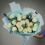 Ribbon - 1 шт. wrapping paper - 4 шт. tissue - 3 шт. эвкалипт 5 стеблей - 5 шт. белые премиальные розы 19 стеблей - 19 шт. голубой оксипеталум-7 стеблей - 7 шт.