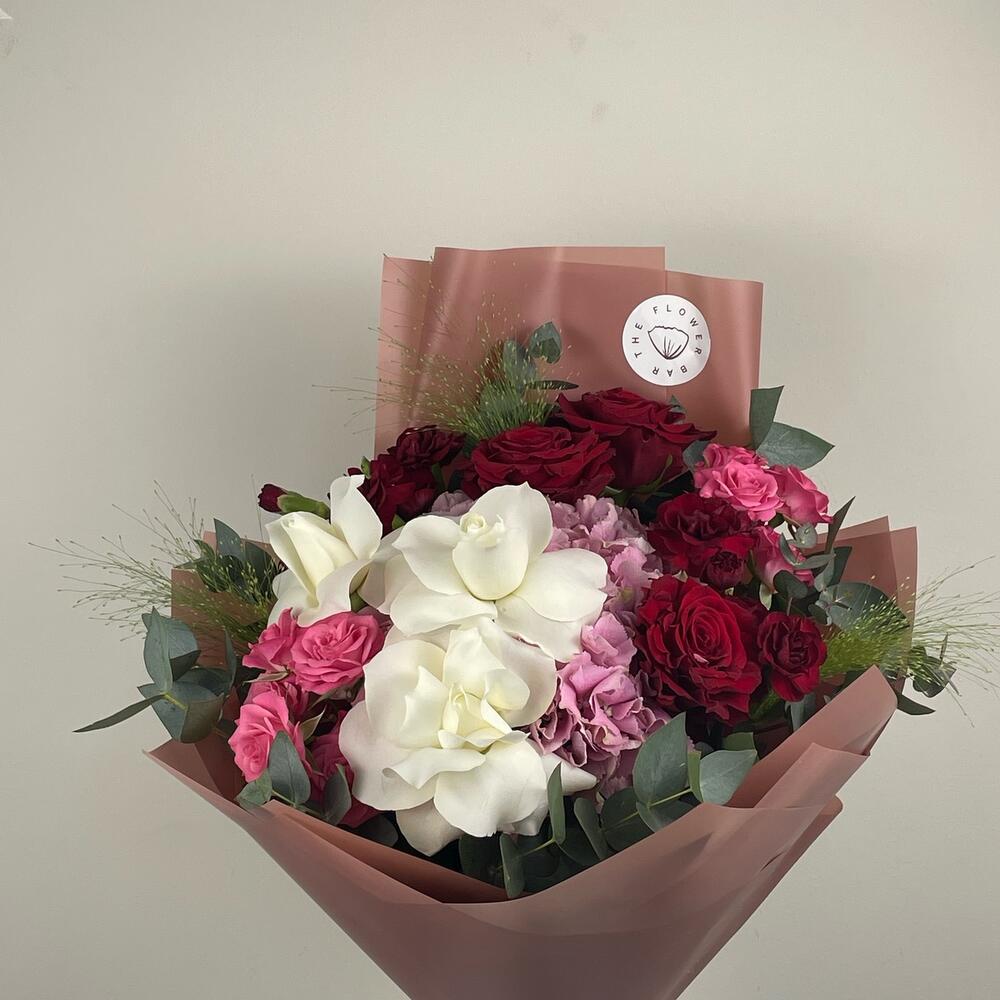 Страстный букет из розовой гортензии, белых роз и красных кустовых роз.