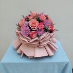 Pink rose - 7 шт. нежно-розовая роза - 4 шт. светло-розовая упаковка - 15 шт. фиолетовая хризантема - 4 шт. нимониум фиолетовый - 4 шт.