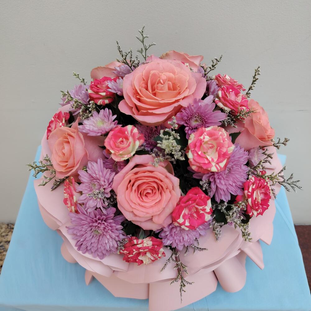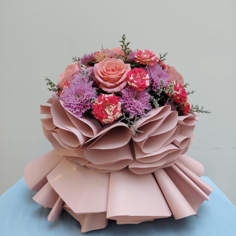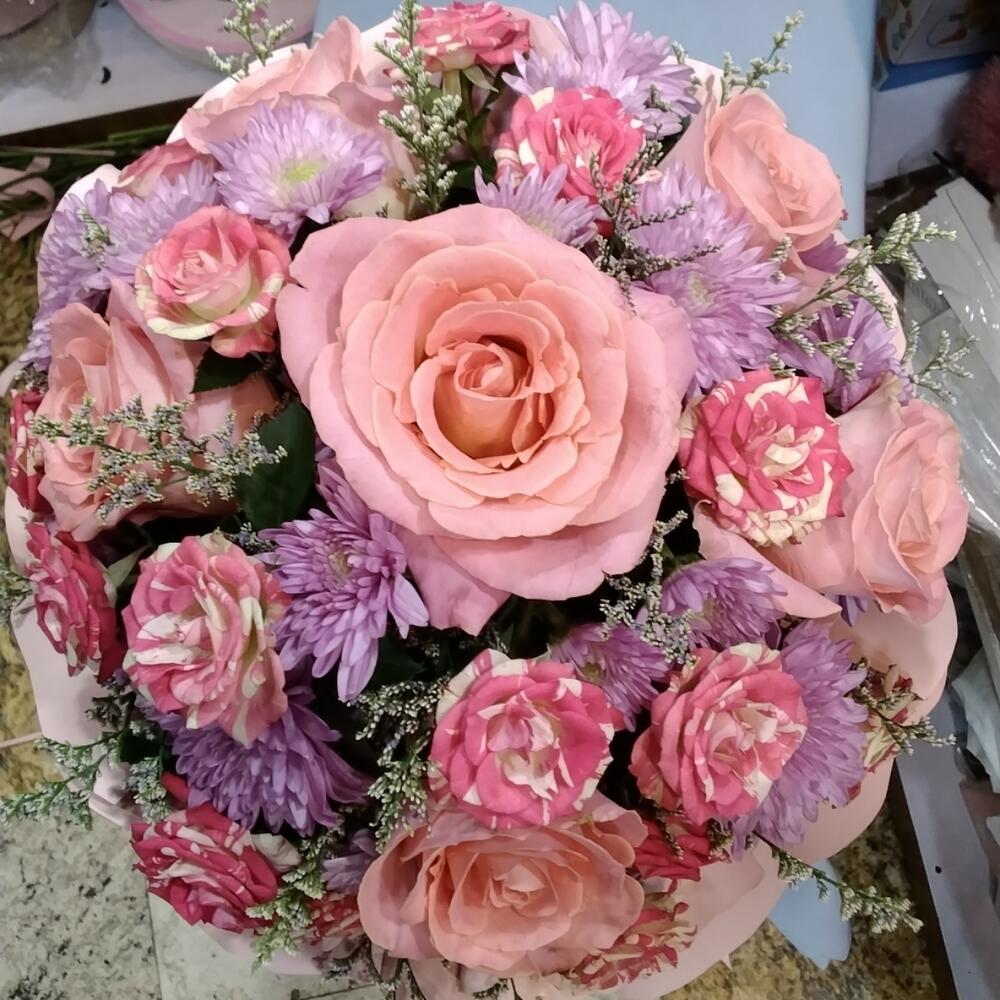 Pink rose - 7 шт. нежно-розовая роза - 4 шт. светло-розовая упаковка - 15 шт. фиолетовая хризантема - 4 шт. нимониум фиолетовый - 4 шт.