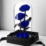 Три большие синие стабилизированные розы бережно оформлены под стеклянным куполом.