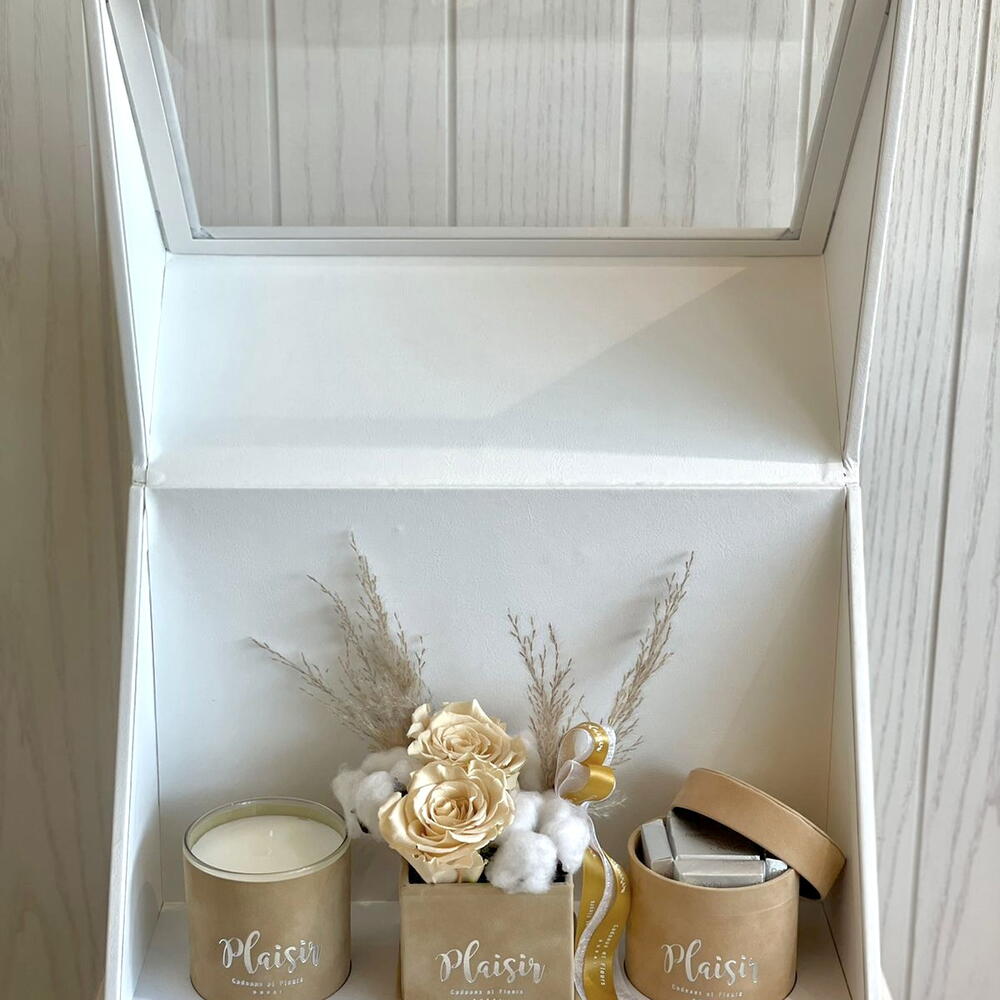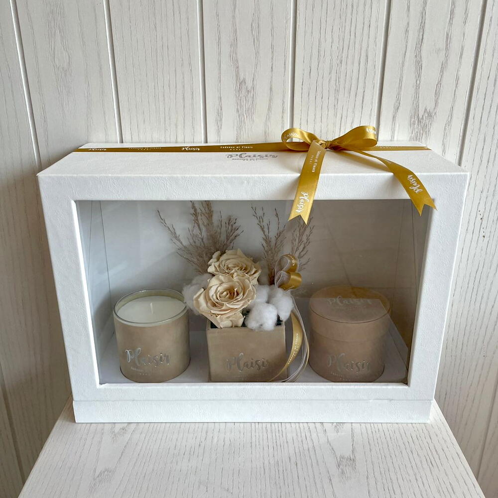 Подарочный набор «Трио» от Plaisir избавит вас от необходимости гадать над выбором идеального и продуманного подарка. В набор входят роскошная свеча, изысканные шоколадные конфеты и двойная роза «Бесконечность», также известная как «Вечная роза» или «Сохранённая роза», которая простоит не один год. Каждый предмет декорирован бархатом в тон и элегантно упакован в роскошную подарочную коробку. (Размер композиции «Бесконечность» — 8х8 см, размер шоколадной коробки — 8х8 см, размер свечи — 9,5х8 см)