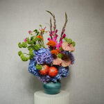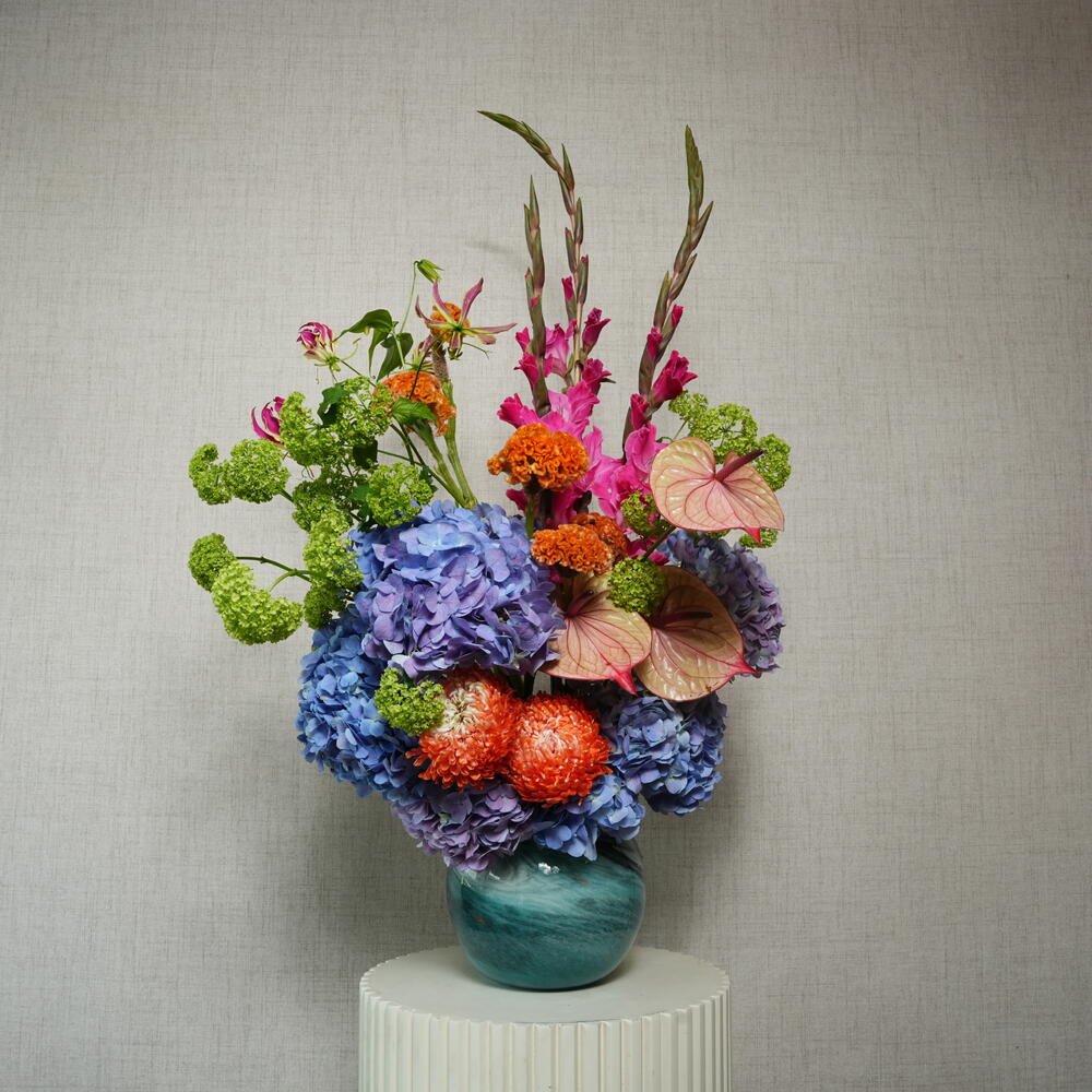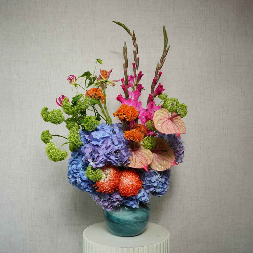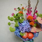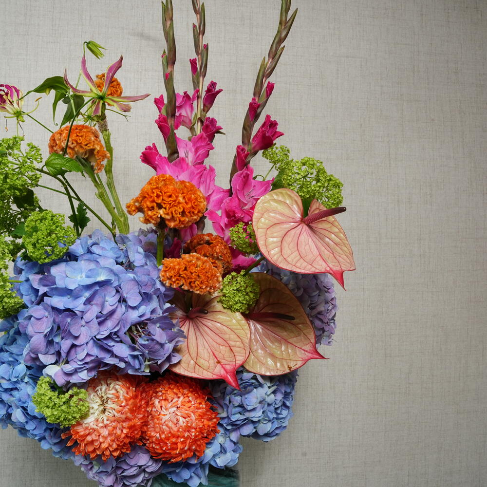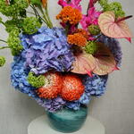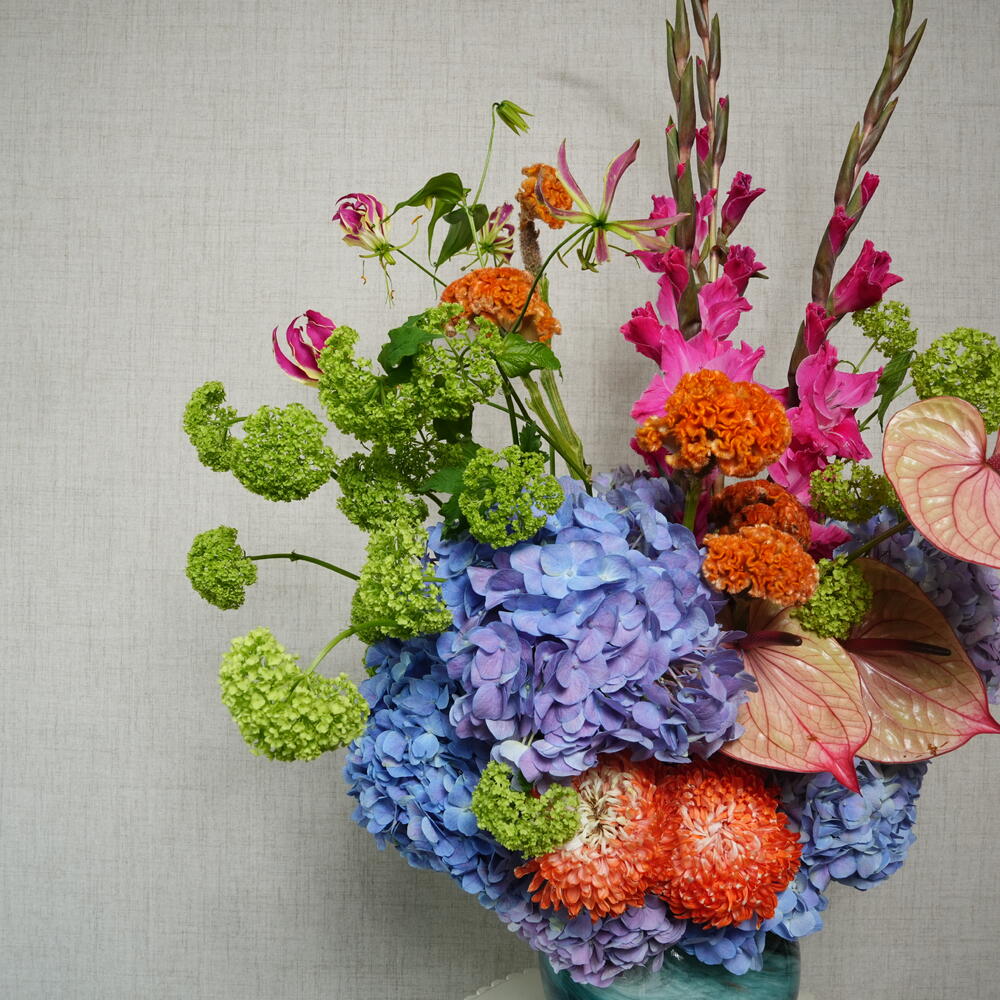 Hydrangea - 5 шт. Chrysanthemum - 3 шт. Viburnum - 3 шт. Антуриум - 3 шт. celosia - 5 шт. гладиолус - 3 шт. gloriosa - 3 шт.