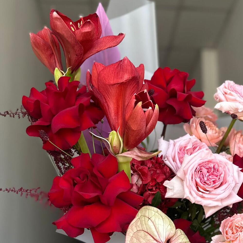 Изысканное воплощение страсти и элегантности, букет «Истинная любовь» из красных роз и антуриумов – это созданное вручную выражение глубокой привязанности. Созданный с использованием богатой палитры бархатистых красных и нежных розовых оттенков, этот букет сочетает в себе смелую романтику и утонченное очарование. Классические красные розы «Истинная любовь» символизируют преданность, а скульптурный антуриум добавляет современный, роскошный акцент. Премиальные розы сортов «Жульета» и «О’Хара» придают мягкую текстуру и романтические слои, дополненные пышной гортензией и воздушной астильбой для полноты и изящества. Эффектные бутоны амариллиса добавляют драматизма и высоты, а сангуисорба и немного зелени стрелиции завершают композицию, придавая ей современный вид. Красиво упакованный в элегантную полупрозрачную бумагу, этот букет идеально подходит для годовщин, Дня святого Валентина, предложений руки и сердца, дней рождения или незабываемых романтических жестов.