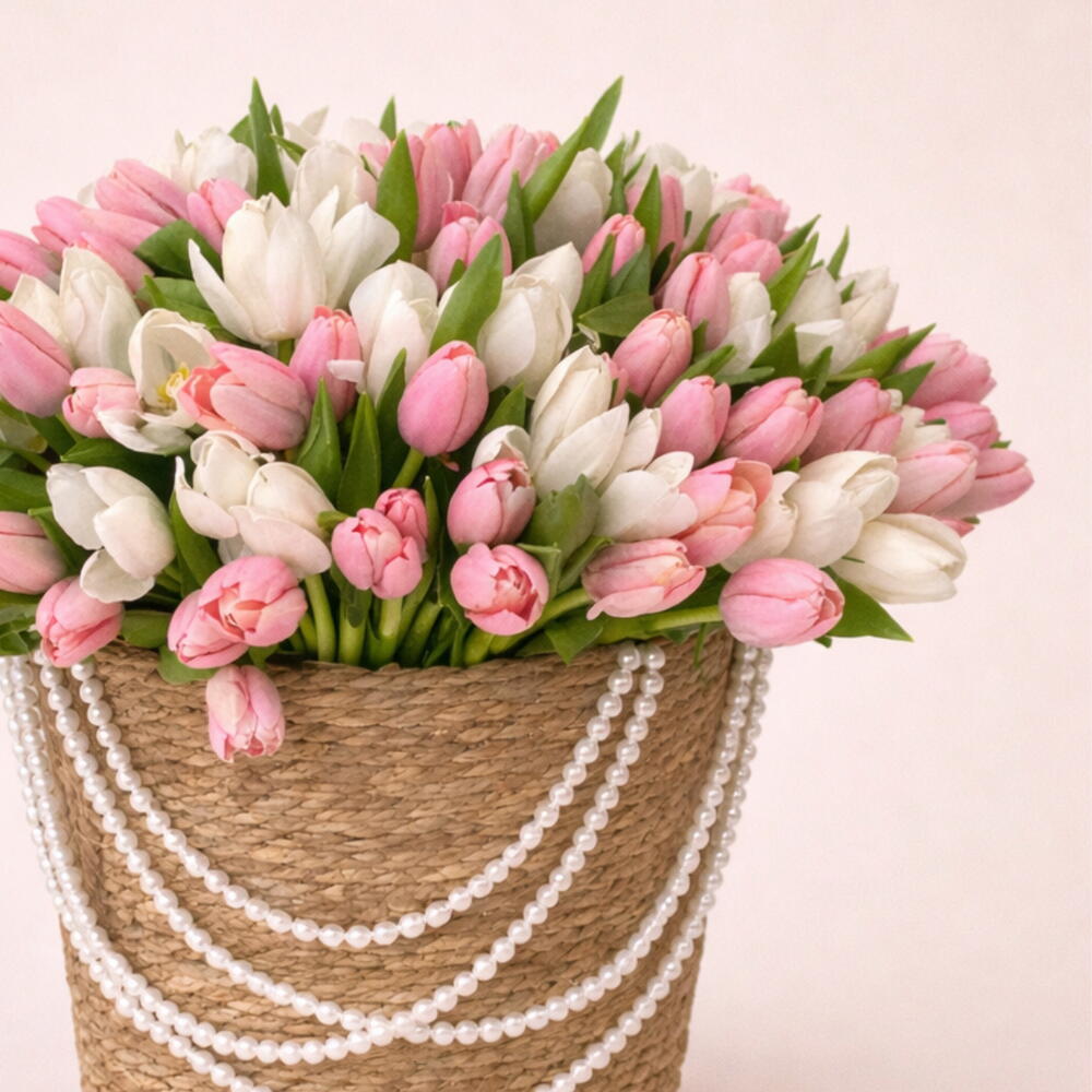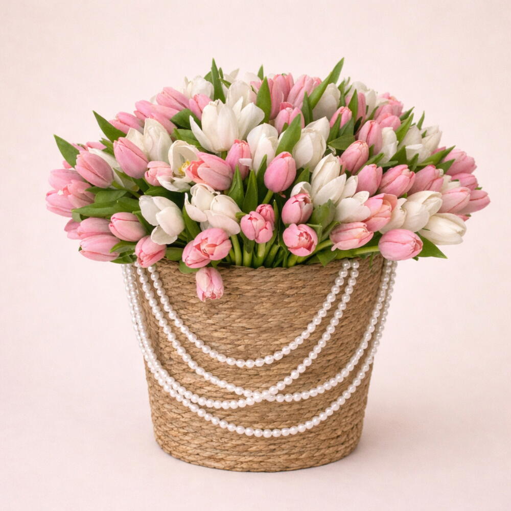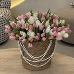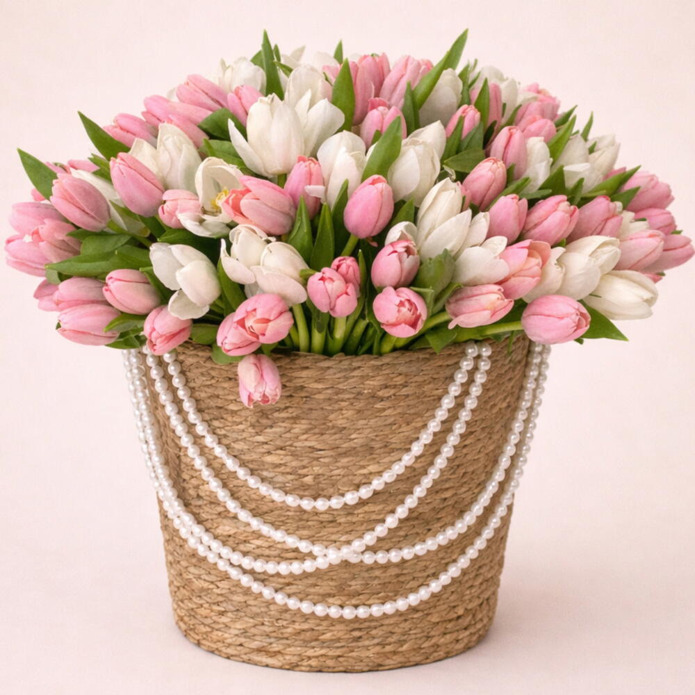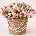 Изысканная и нежная композиция, в которой грациозно сочетаются мягко-розовые и чисто-белые тюльпаны, красиво оформленные в очаровательной корзинке ручной работы. Нежная цветовая гармония создаёт лёгкую, романтичную, вдохновлённую весной атмосферу, которая кажется свежей и элегантной.