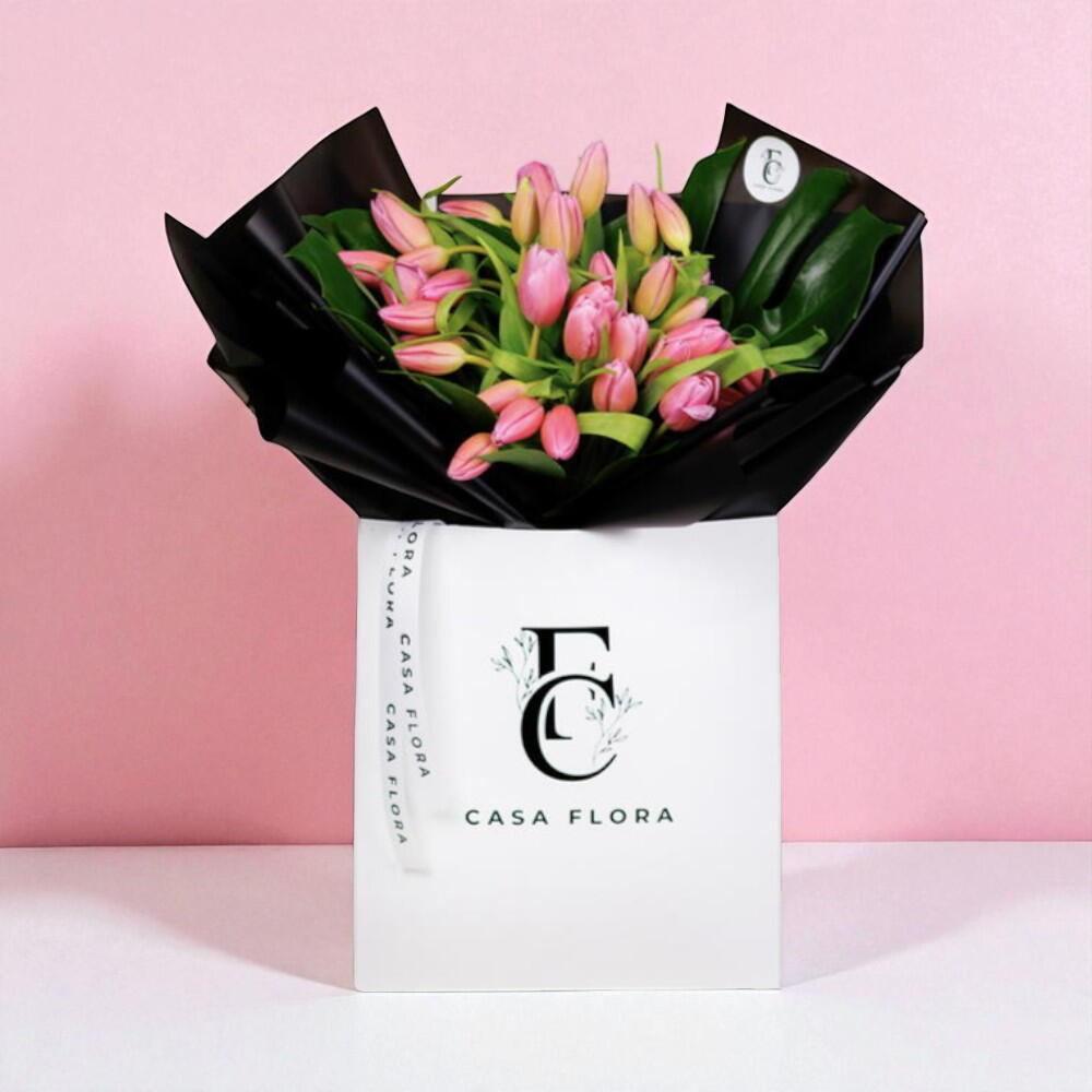 Нежный букет из 30 розовых тюльпанов, символизирующий любовь, изящество и восхищение. Идеален для празднования особых моментов или выражения искренних чувств с вечной элегантностью.”
