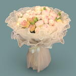 Нежность в фатине: нежный букет роз в пастельных тонах, с любовью завернутый в мягкий белый фатин с рюшами, создающий очаровательное и изящное оформление.