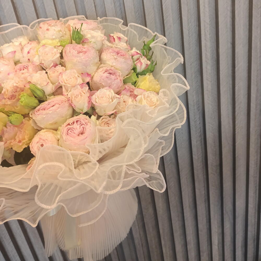 Нежность в фатине: нежный букет роз в пастельных тонах, с любовью завернутый в мягкий белый фатин с рюшами, создающий очаровательное и изящное оформление.