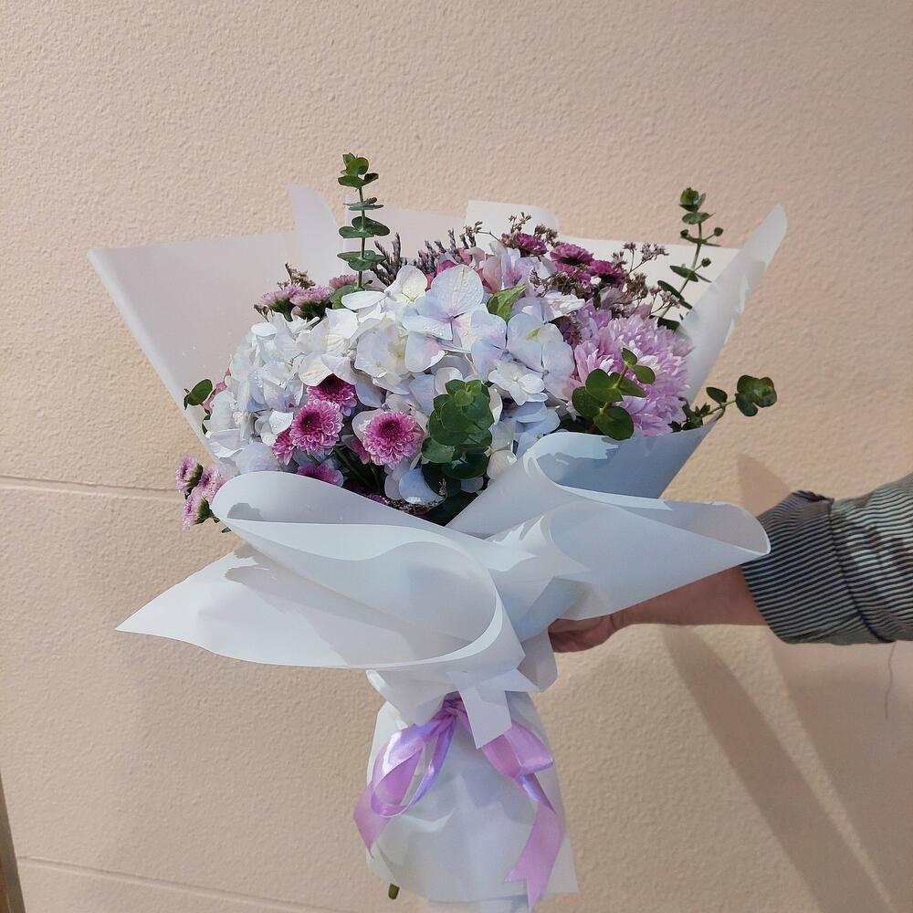 purple chrysanthemums - 3 шт. purple santini - 4 шт. маленький эвкалипт - 5 шт. белая или фиолетовая гортензия - 1 шт.